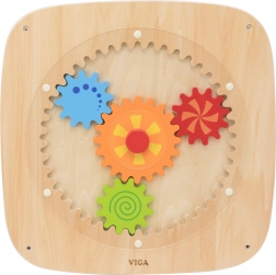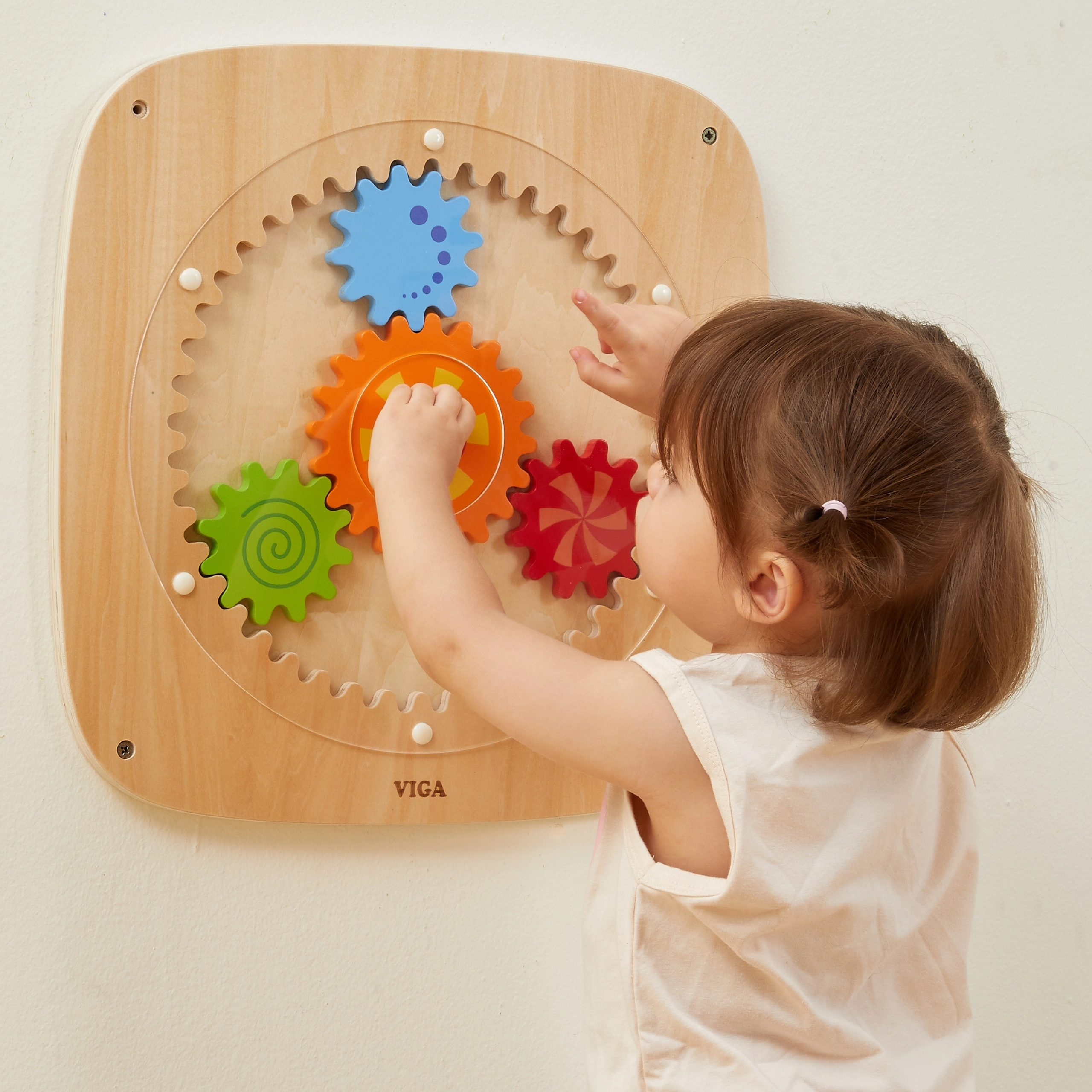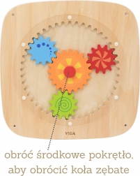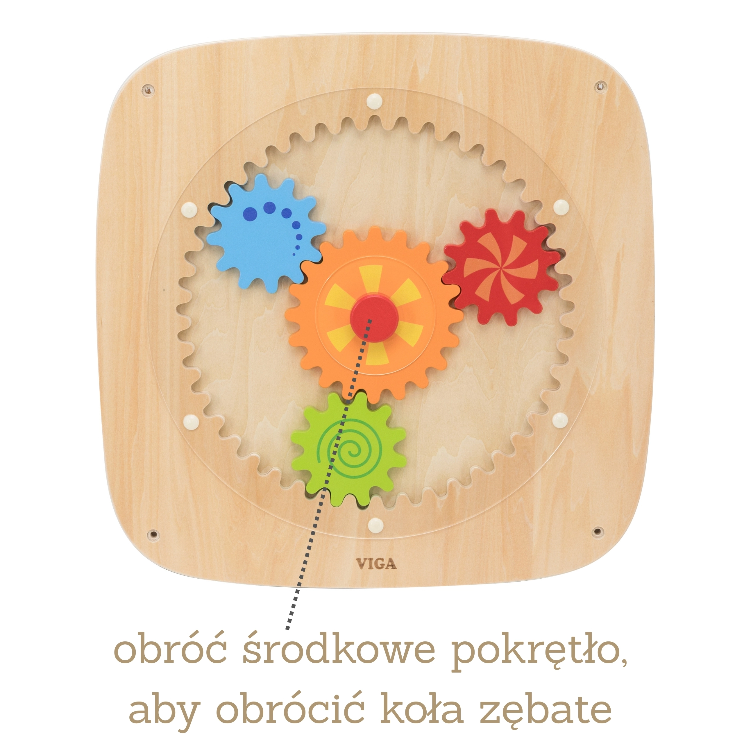 Ta lesena stenska tabla z barvnimi zobniki je zasnovana tako, da otrokom prinaša veselje do raziskovanja. Z vrtenjem osrednjega kolesca se hkrati zavrtijo vsi prenosi, kar otrokom naravno prikazuje princip sile, gibanja in vzročno-posledičnih povezav. Različne barve in vzorci na kolesih pri vrtenju ustvarjajo privlačne vizualne učinke.