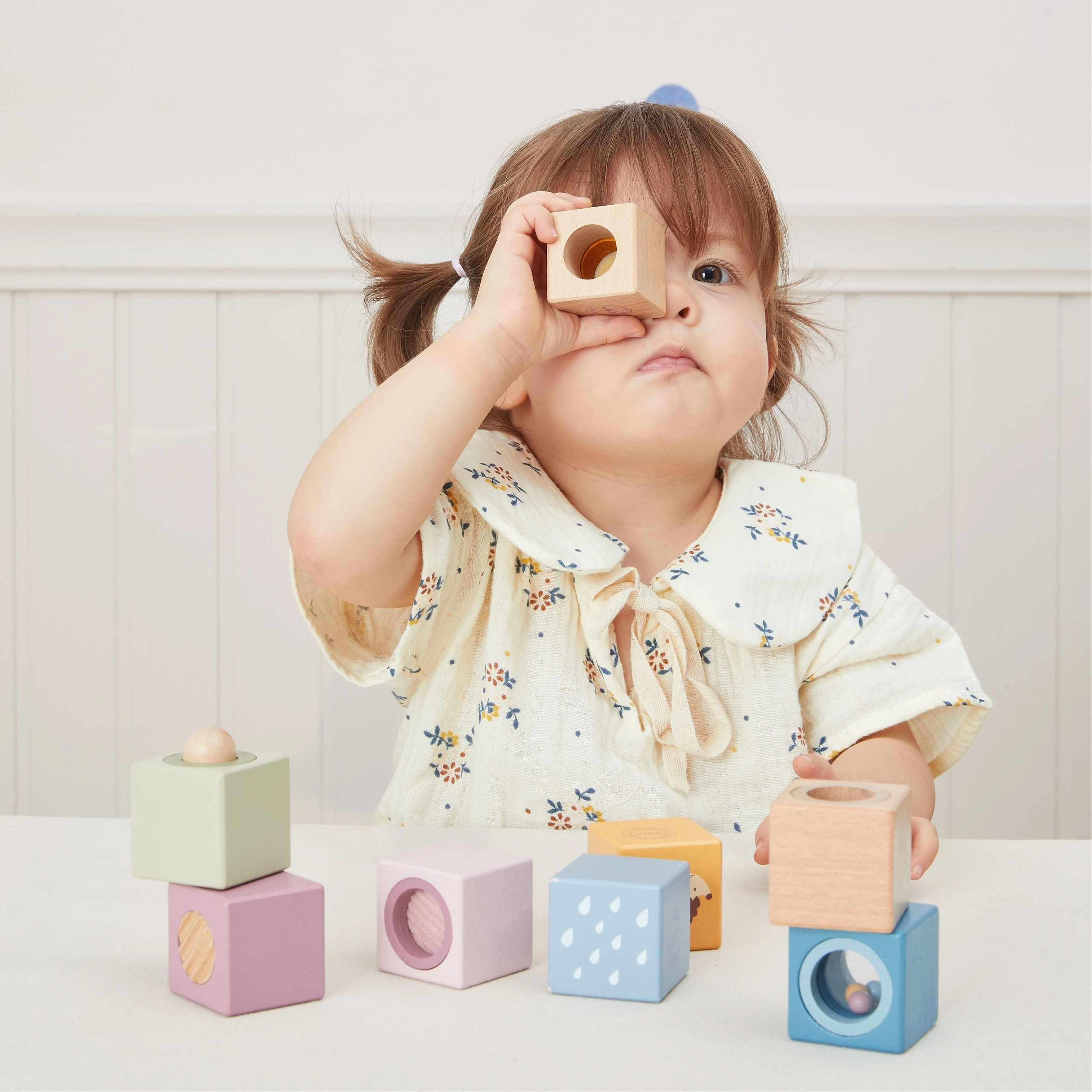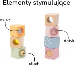 Vsaka kocka ima edinstven element za multisenzorično stimulacijo – od zrcalca in ropotuljice do tipnih struktur. Zaradi prijaznih mer se zlahka primejo, razvijajo koordinacijo oko–roka, fino motoriko in spodbujajo kreativno prosto igro.