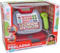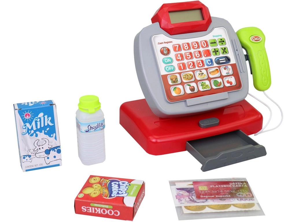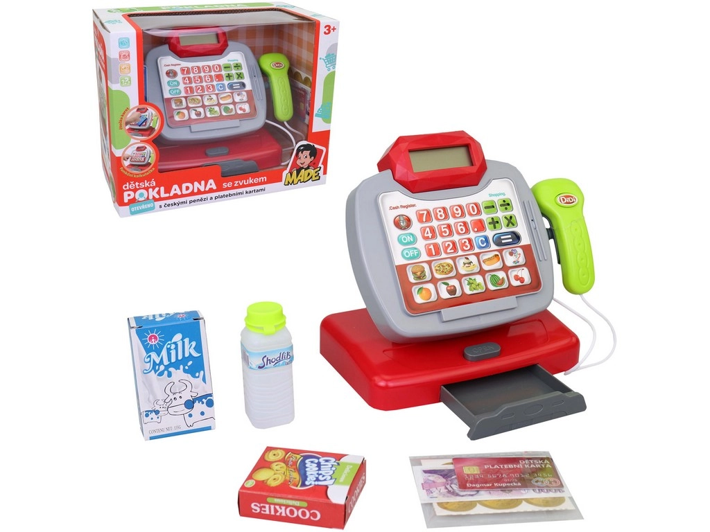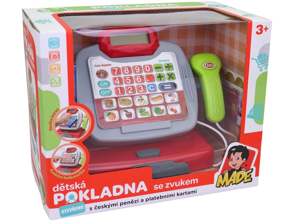 Priloženi so bogati dodatki: češki papirnati bankovci, plastični kovanci različnih vrednosti in plačilne kartice. Otroci tako na zabaven način vadijo računanje in plačilne navade. Robustna plastična izvedba zagotavlja odpornost pri vsakodnevni igri.