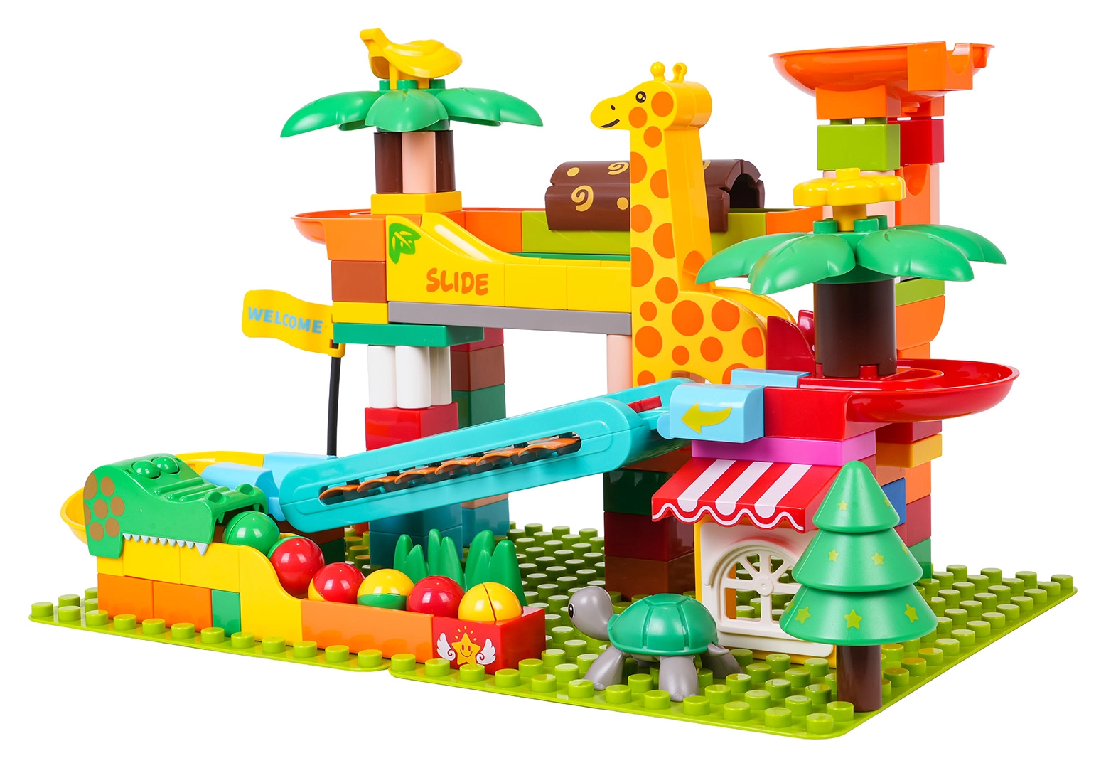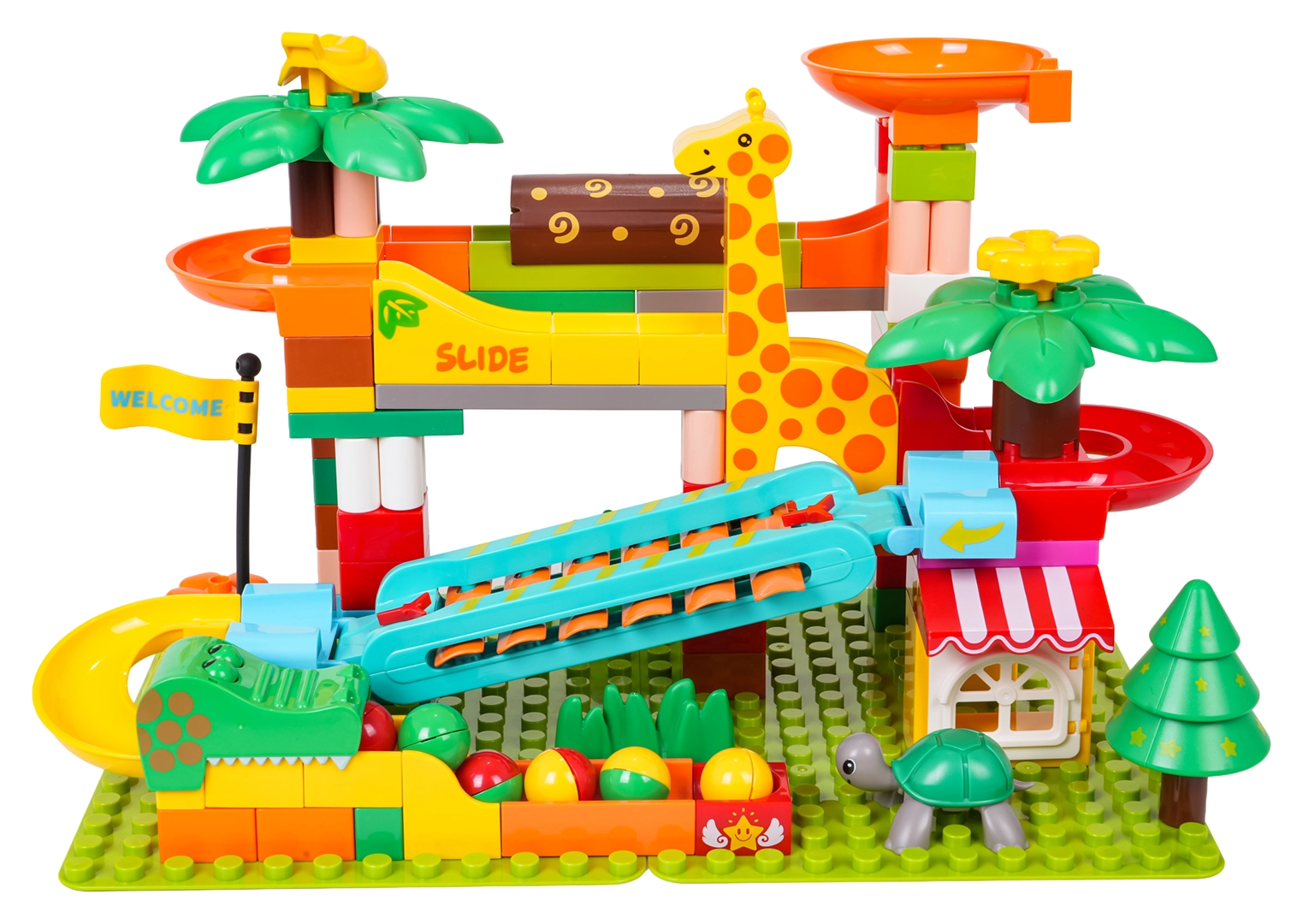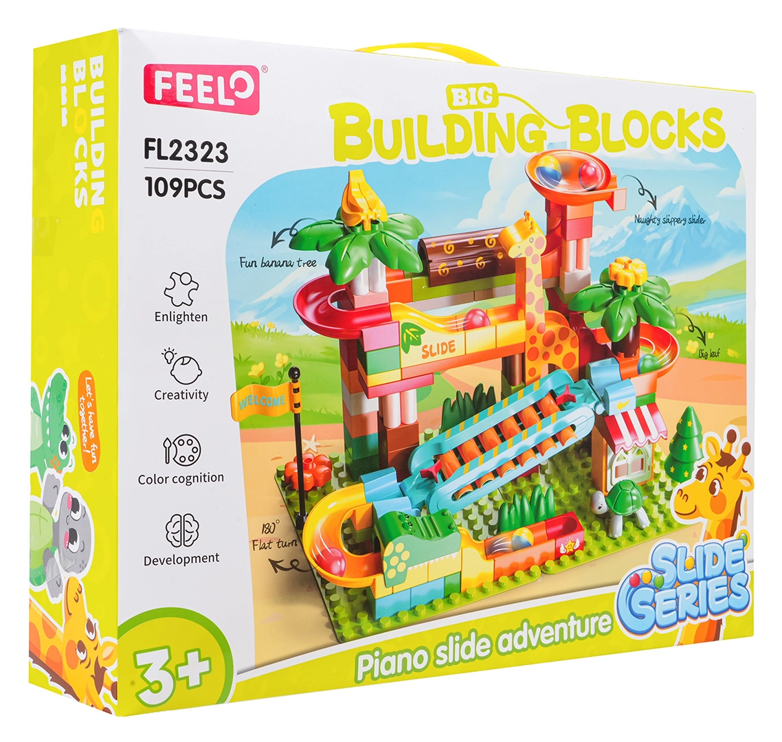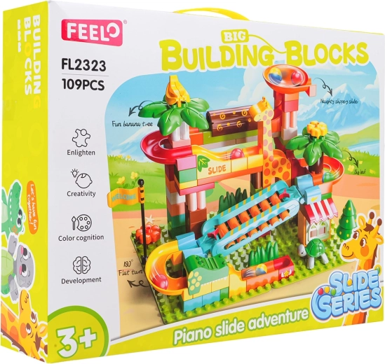 Ta ustvarjalni komplet pričara v otroško sobo vzdušje safarija: palme, živalice in hišica dopolnjuje preudarno zasnovana kroglična steza s tobogani, lijaki in klavirskim elementom – ko kroglice drsijo preko ksilofona, nastajajo vesele melodije. Stabilna osnova in preprosto pripenjanje delov zagotavljata prijetno sestavljanje in igro.