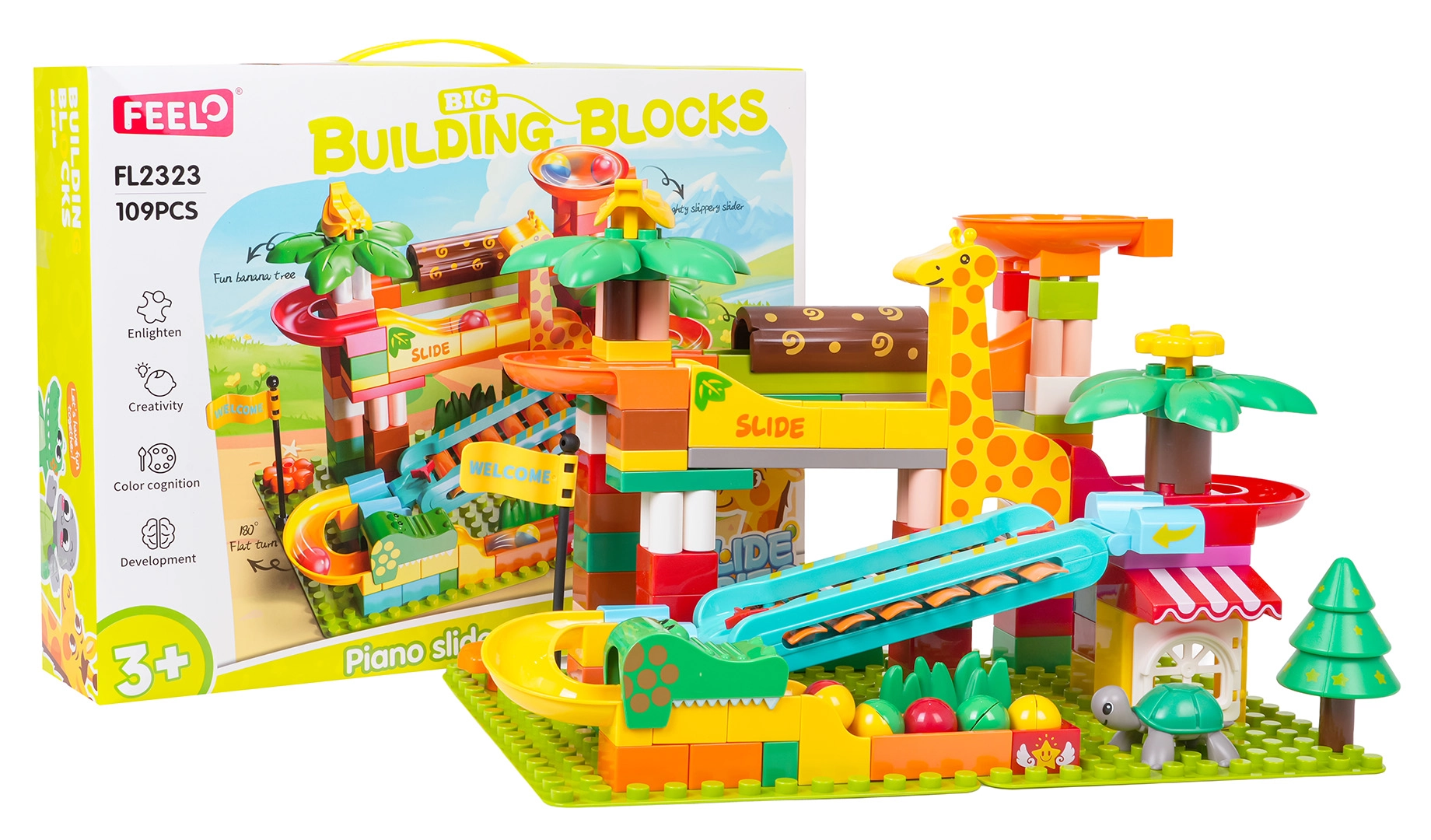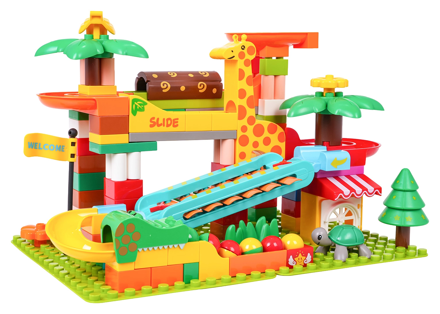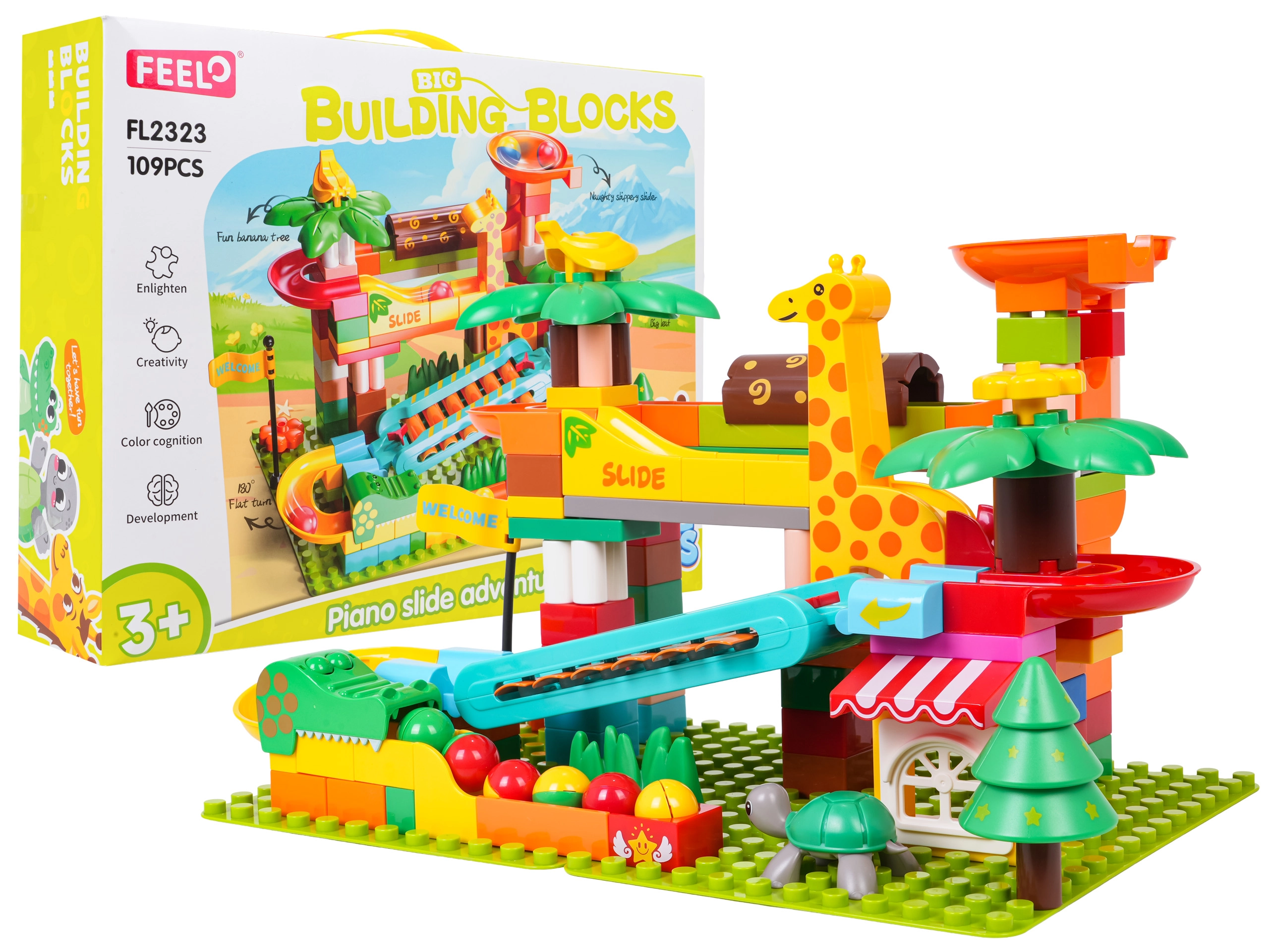 Ta ustvarjalni komplet pričara v otroško sobo vzdušje safarija: palme, živalice in hišica dopolnjuje preudarno zasnovana kroglična steza s tobogani, lijaki in klavirskim elementom – ko kroglice drsijo preko ksilofona, nastajajo vesele melodije. Stabilna osnova in preprosto pripenjanje delov zagotavljata prijetno sestavljanje in igro.