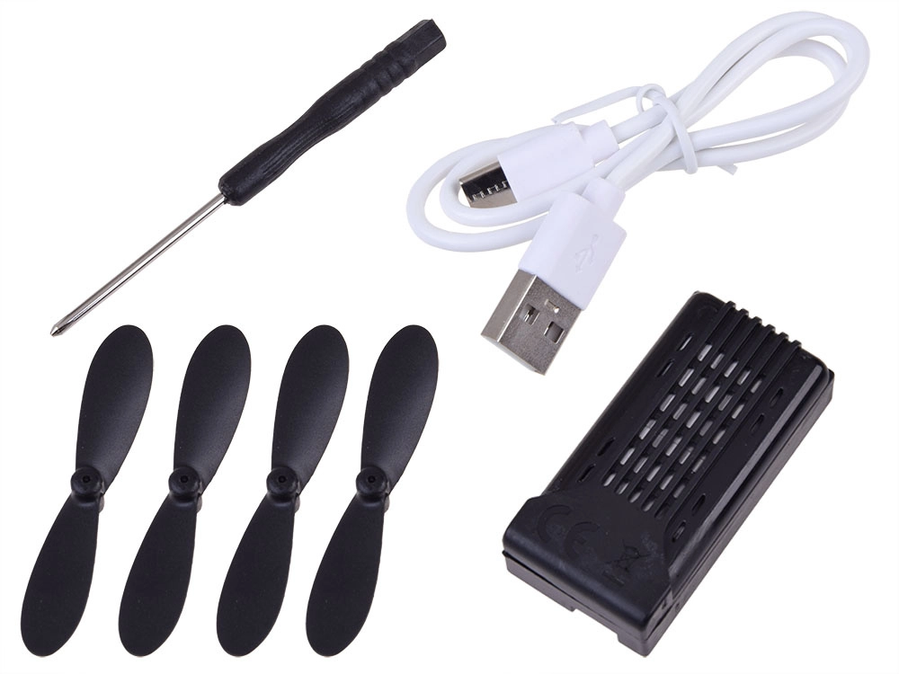 Intuitiven oddajnik na frekvenci 2,4 GHz zagotavlja samodejno seznanjanje, enostavno kalibracijo in udobno upravljanje. Ne manjka nujna zaustavitev, brezglavi način, lebdenje in LED luči za boljšo orientacijo. Polnjenje preko USB kabla, let traja nekaj minut, polnjenje približno 60 minut.