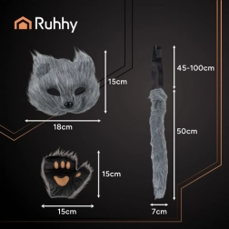 Izrazite se v celoti s stilskim setom RUHHY 4v1. Kombinacija maske na elastiki, dolgega nastavljivega repa s prožno žičko in ljubkih tačk/rokavic ustvarja vsestranski kostum za cosplay, konvencije, zabave, videe in tematsko fotografiranje. Mehka in prijetna izvedba iz umetnega krzna je udobna za nošenje in deluje realistično.