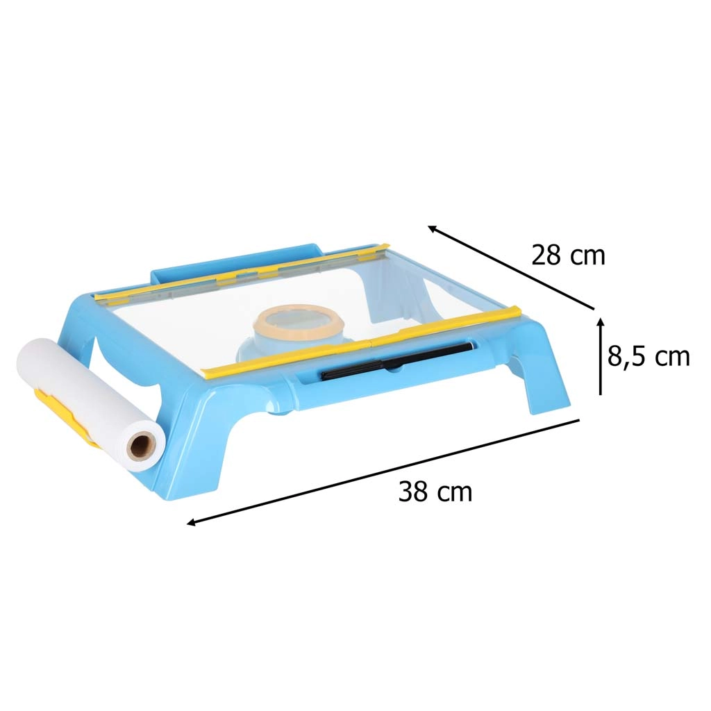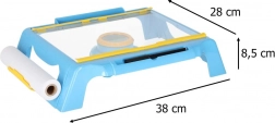 Stabilno plastično podnožje z poševno delovno površino in držalom za papirno rolo otrokom zagotavlja udobne pogoje za risanje doma in na poti.