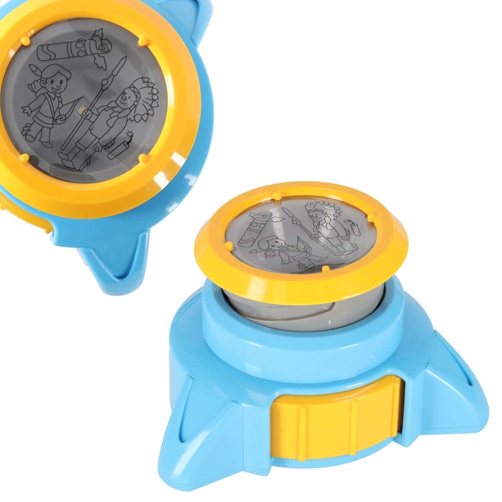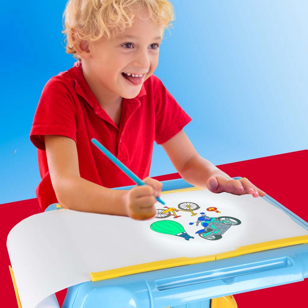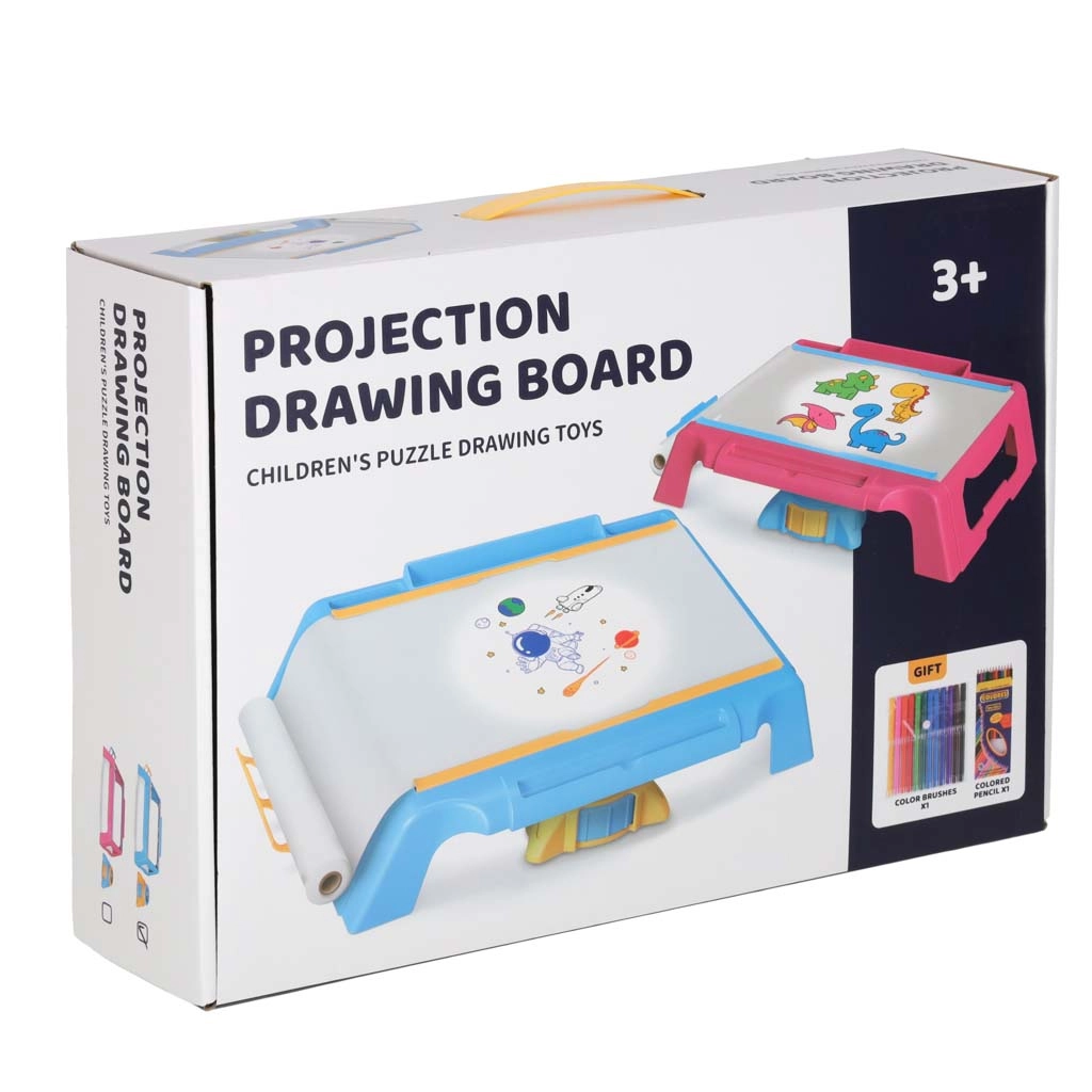 Ta izobraževalni projektor projicira slike na papir, zato lahko otroci zlahka prekrivno rišejo in postopoma pridobivajo samozavest pri risanju. Zahvaljujoč nastavljivemu ostrenju in stabilni mizici je delo udobno na mizi ali na tleh. Modro–rumena izvedba je trpežna in varna za male umetnike.