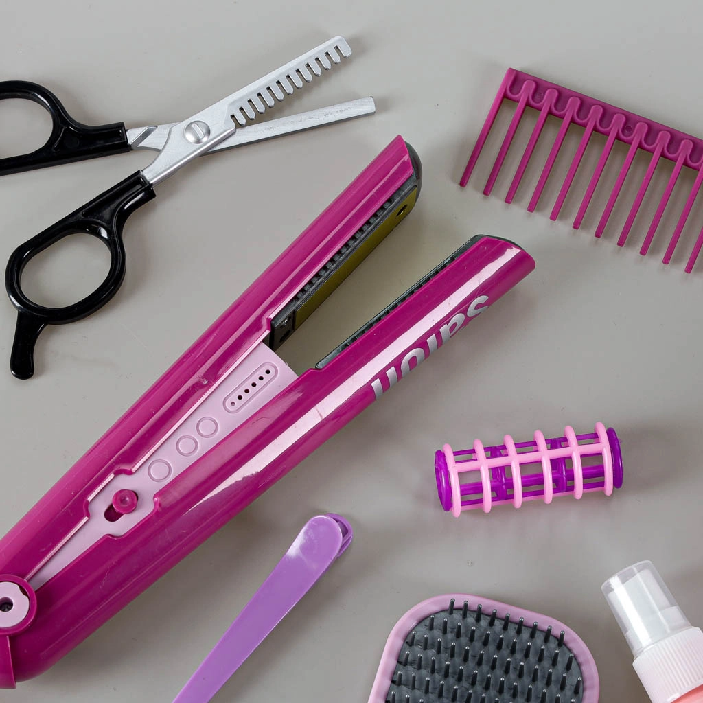 Privoščite otrokom realistično zabavo brez tveganja. Interaktivni sušilnik oddaja verodostojne zvoke in omogoča nastavitev „intenzivnosti sušenja“, medtem ko likalnik po pritisku sveti in oddaja zvok, vendar se ne segreva – igra je tako popolnoma varna. Rožnato-vijoličen komplet bo navdušil male stiliste in stilistke, številni dodatki pa pomagajo uriti fino motoriko in socialne veščine.