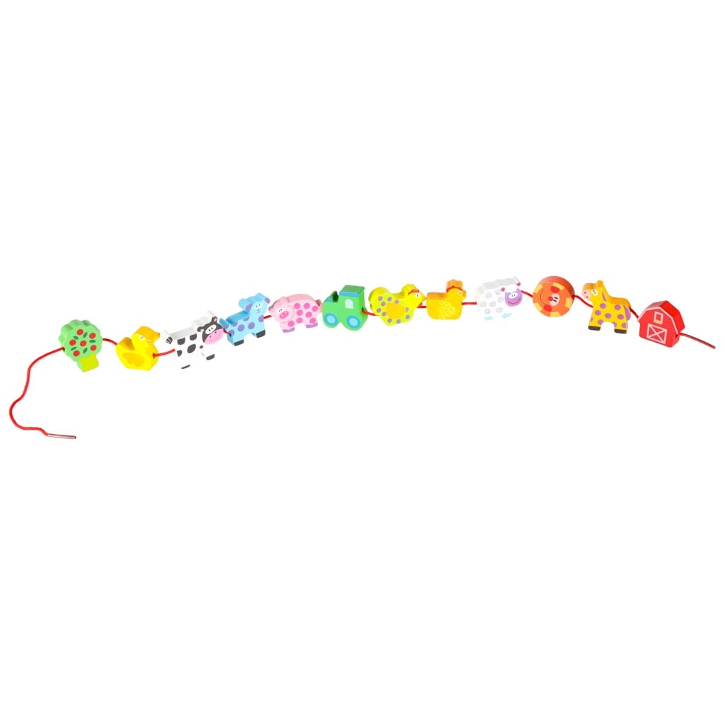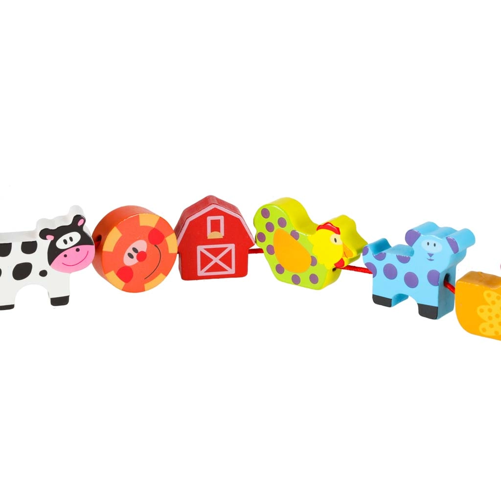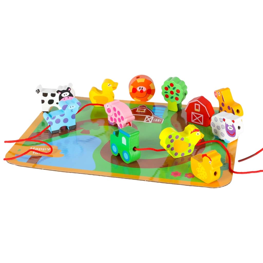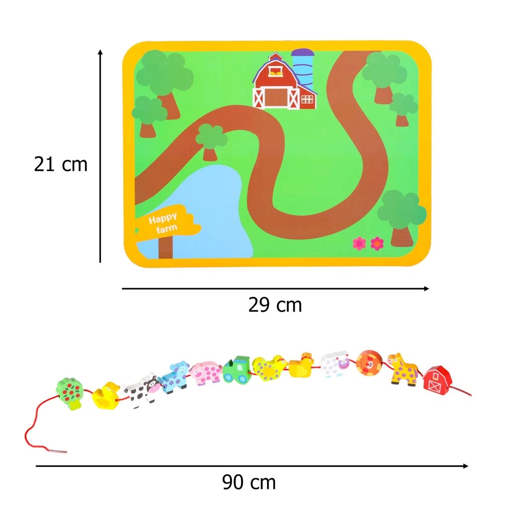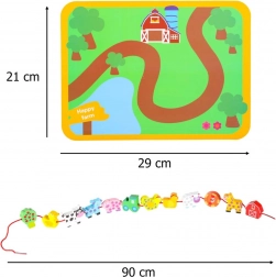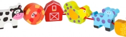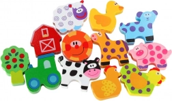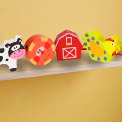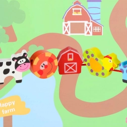 Ta barviti leseni komplet s kmečkimi motivi združuje zabavo in učenje. Otroci lahko natikajo živali, skedenj, traktor in druge dele na vrvico, sestavljajo prizore na priloženi deski ter tako razvijajo motoriko, logično mišljenje in domišljijo. Gladko obdelani, robustni deli odlično sedejo v otroško dlan.