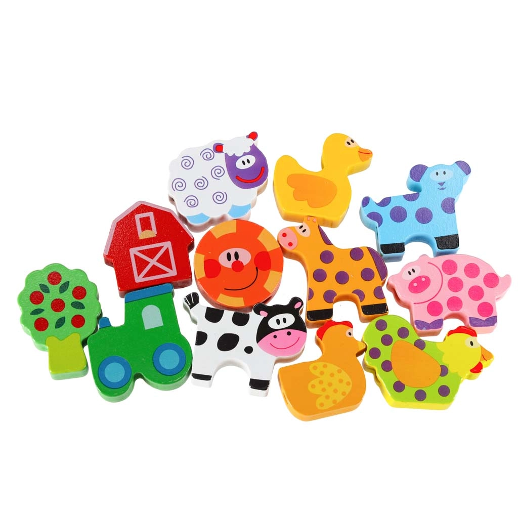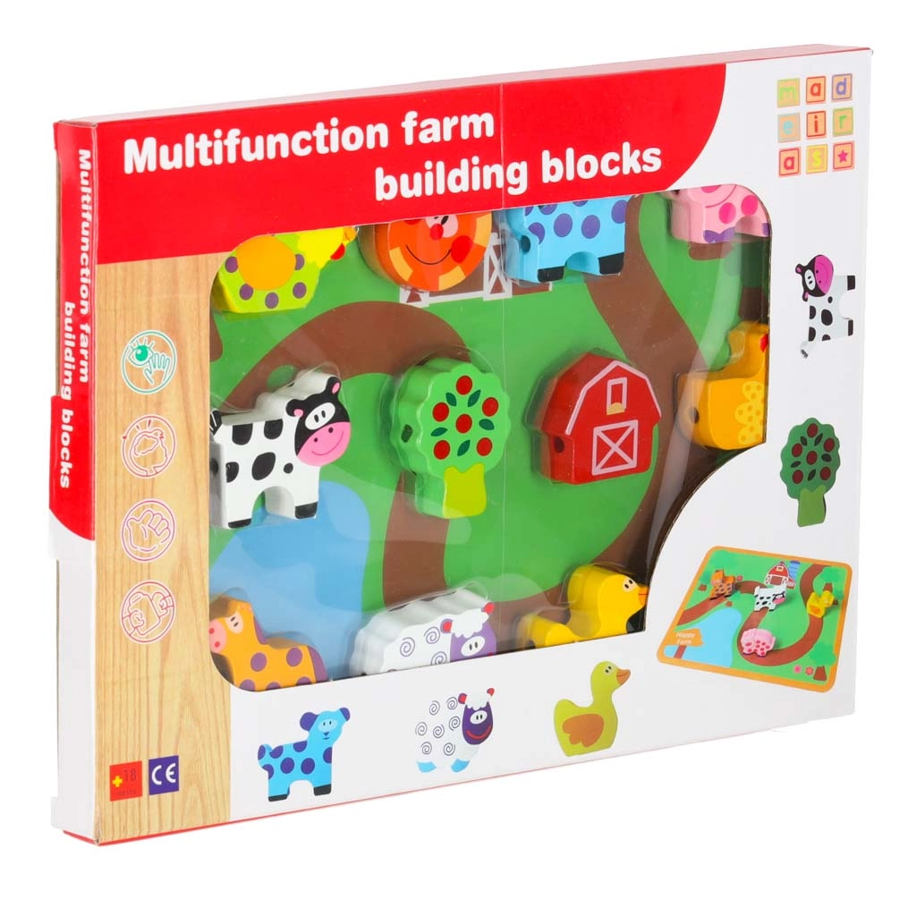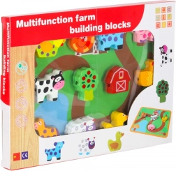 Živali, skedenj, drevo in traktor pomagajo otrokom spoznavati barve, oblike in zaporedja. Robustni deli so enostavni za prijemanje in zlaganje.