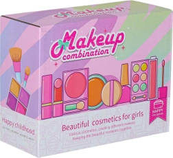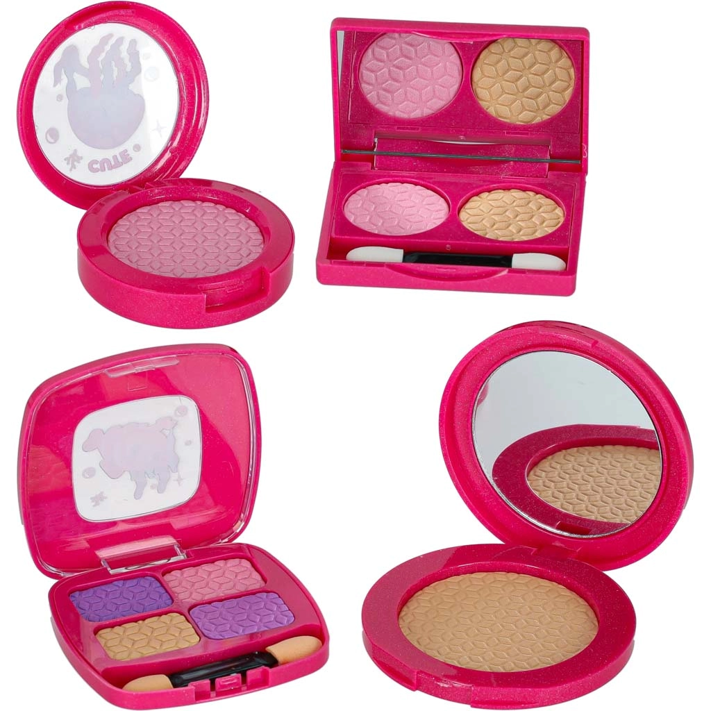 - Kovček z ogledalcem; čopič za rdečilo; krtačka/ glavniček za obrvi; 3× čopič za oči; puder + gobica; rdečilo; dvojna senčila za oči + aplikator; četverna senčila za oči + aplikator; šminka; 4× lonček z bleščicami; glos za ustnice v lončku; maskara (prazna); razpršilec s pumpico; 2× »lak« za nohte; separator prstov; navodila