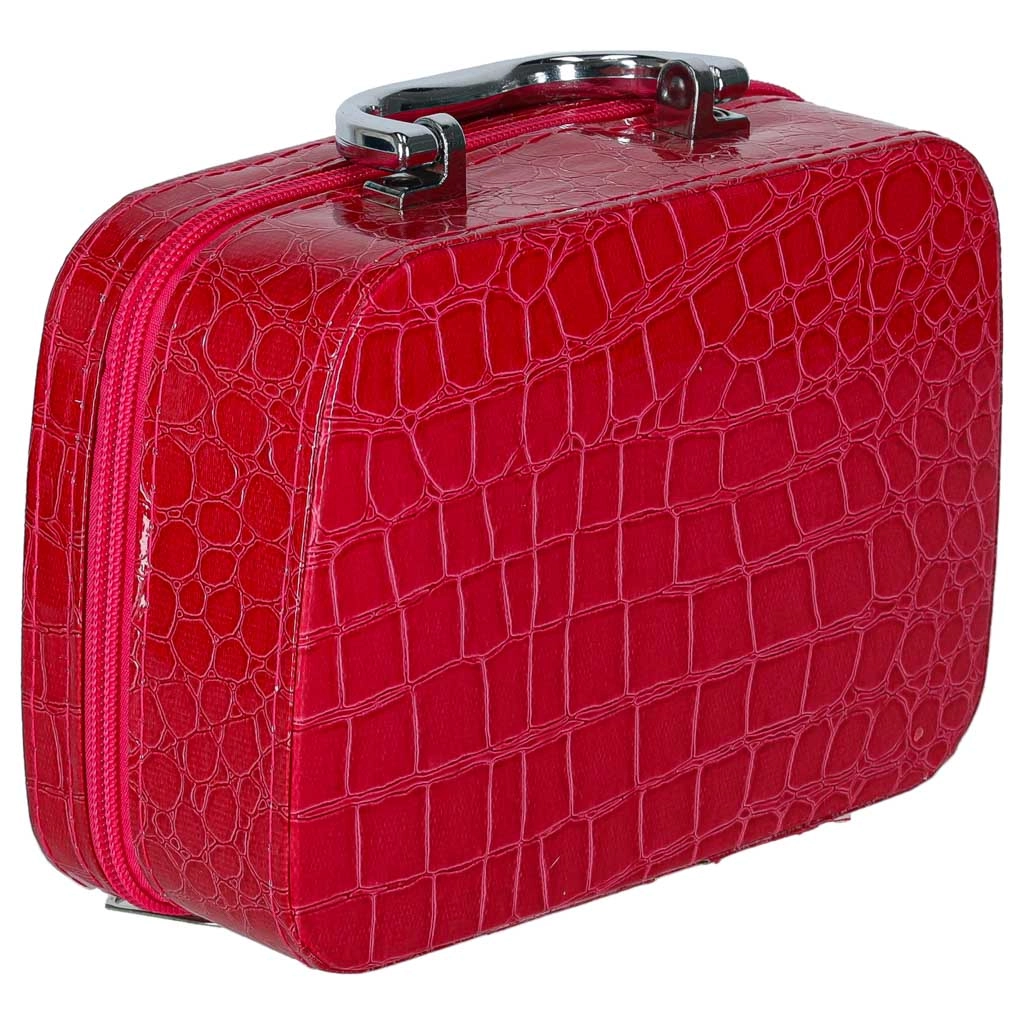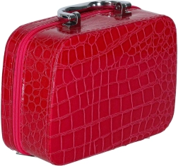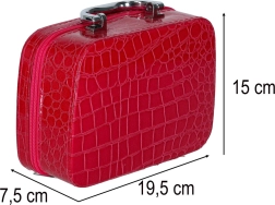 Lahek kovček z ročajem, dvojno zadrgo in ogledalcem ohranja vse dodatke na svojem mestu. Kovinske nogice zagotavljajo stabilnost na vsaki površini.