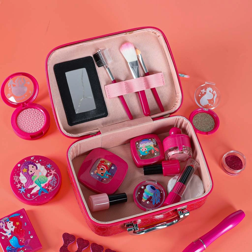 Stilski otroški kovček s kozmetiko za otroke od 3 let prinaša varno ustvarjalno zabavo brez nereda. Vsi elementi so le posnemovalci pravih ličil – senčila in pudri iz barvne pene, prazna maskara – zato se lahko otroci igrajo brez tveganja. Kovček iz materiala, ki posnema usnje, ima praktičen ročaj, dvojne zadrge in stabilne kovinske nogice za udobno prenašanje in shranjevanje.