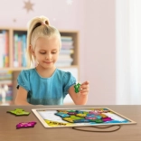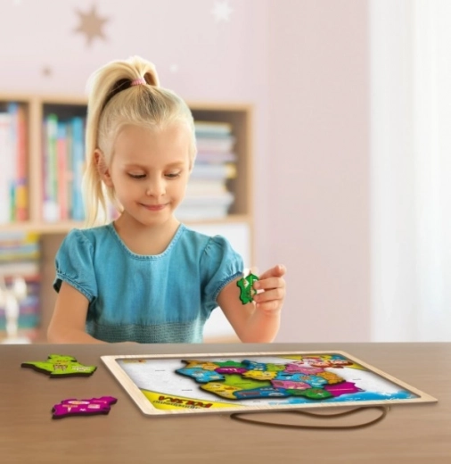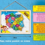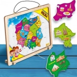 Vsak magnetni košček ponazarja določeno regijo in njene značilne znamenitosti in simbole, zato si otroci lažje zapomnijo pomembne informacije o državi. Zahvaljujoč magnetnemu ozadju se koščki enostavno nameščajo in ostanejo na mestu – idealno za učenje doma in zabavo.