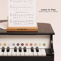 Robustne lesene noge zagotavljajo stabilnost in vzdržljivost, da klavir prenese dolge ure igranja. Dva dvostranska notna lista z osmimi priljubljenimi otroškimi izštevankami v angleščini na igriv način spodbujata razvoj osnovnih glasbenih spretnosti. Leseno stojalo varno drži note na mestu za udobno igranje malih prstkov. Oddaja prijetne zvoke in razvija odnos do glasbe – vendar prvenstveno služi kot igrača, ne kot profesionalno glasbilo.