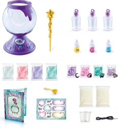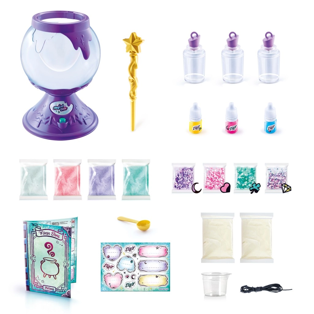 Preprosto nasujte prašek za sluz, dodajte eliksir in okraske, premešajte z zlato zvezdno palčko in opazujte čarovnijo v kotličku. Končane sluzi shranite v čudovite stekleničke z vrvico, ki jih lahko nosite okoli vratu. Idealen ustvarjalni set za začetnike ter male čarovnike in čarovnice.