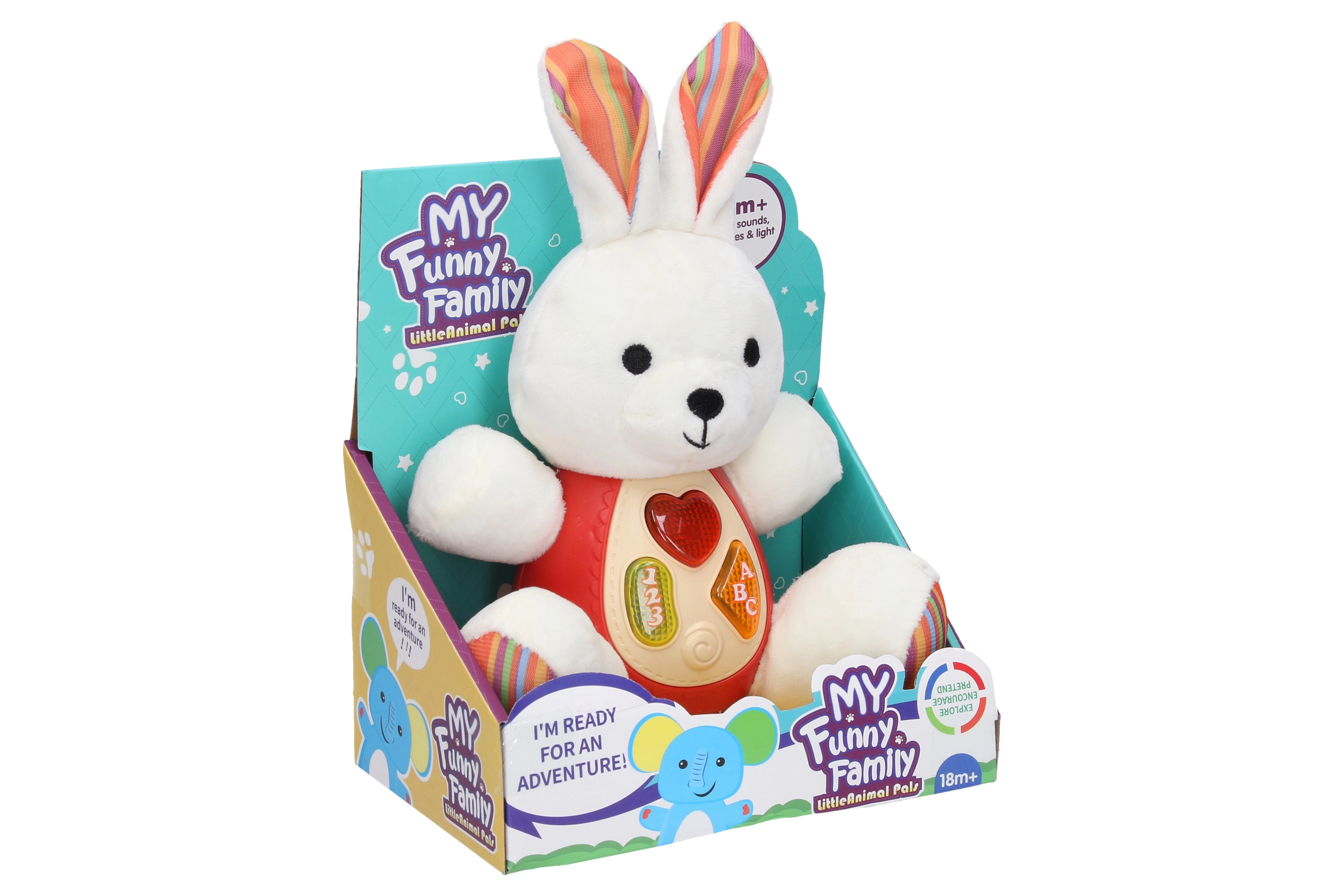 Ta mehki interaktivni zajček je odličen prijatelj za prvo odkrivanje zvokov in lučk. Združuje prijetno plišasto površino z vzdržljivim plastičnim trebuščkom, na katerem otroci preprosto aktivirajo melodije, zvoke in svetlobne efekte. Zaradi kompaktnih mer se udobno drži in je idealen za igro doma ali na poti.