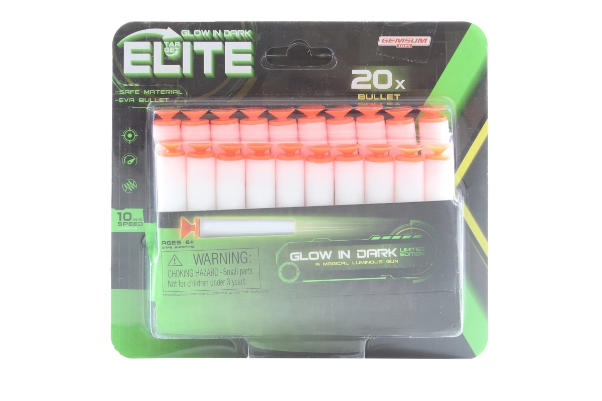 Razširite zalogo streliva za otroške pištole s tem kompletom svetlečih penastih nabojev s priseskom. Naboji so lahki, varni in zaradi svetlečega učinka v temi dobro vidni, kar poveča zabavo in preglednost igre.
