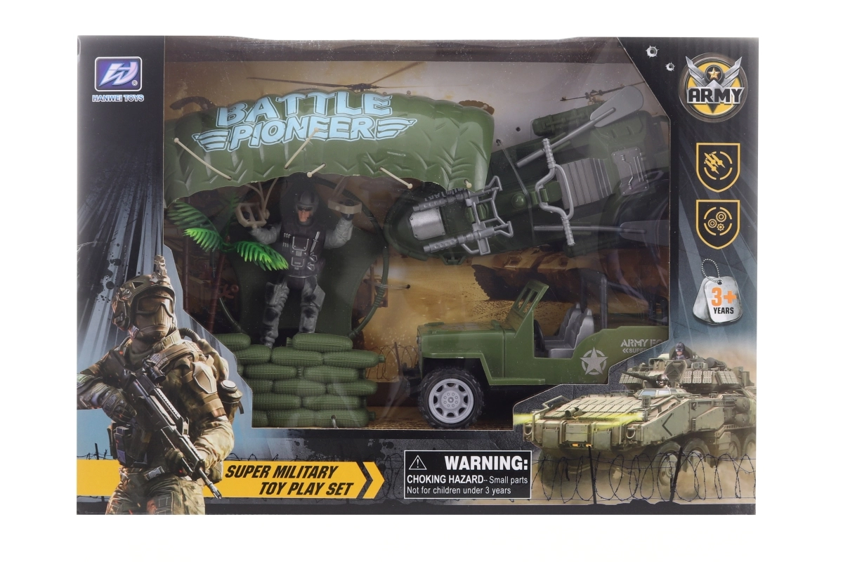 Ta vojaški set otrokom ponuja ure ustvarjalne igre. S padalcem s padalom in vozili lahko zlahka ustvarjajo napete scenarije na kopnem in na vodi. Komplet je izdelan iz lahke, a odporne plastike in je varen za male roke.