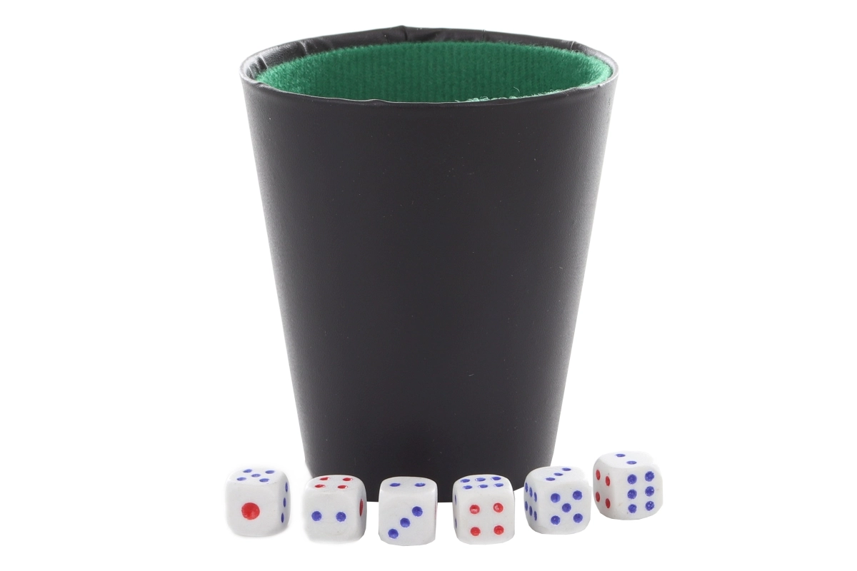 Uživajte v udobnem in kultiviranem metanju kock zahvaljujoč plastičnemu kozarčku s filcano notranjostjo, ki duši zvok in pomaga ohranjati kocke pod nadzorom. Komplet vsebuje šest standardnih igralnih kock velikosti približno 1,2 cm – idealno za klasične namizne igre.