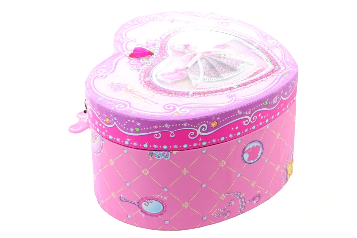 Škatlica nudi varno shranjevanje prstanov, zapestnic in drobnih zakladov. Izdelana je iz trpežnega materiala z dekorativnimi motivi princes, ima pokrov s prozornim srčkom ter zanesljiv zapiralni mehanizem. Odlična ideja za darilo za ljubitelje baleta in nežnih detajlov.