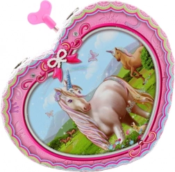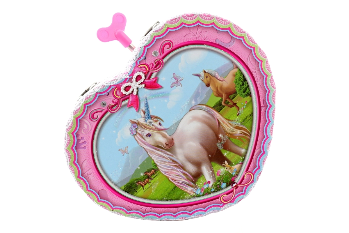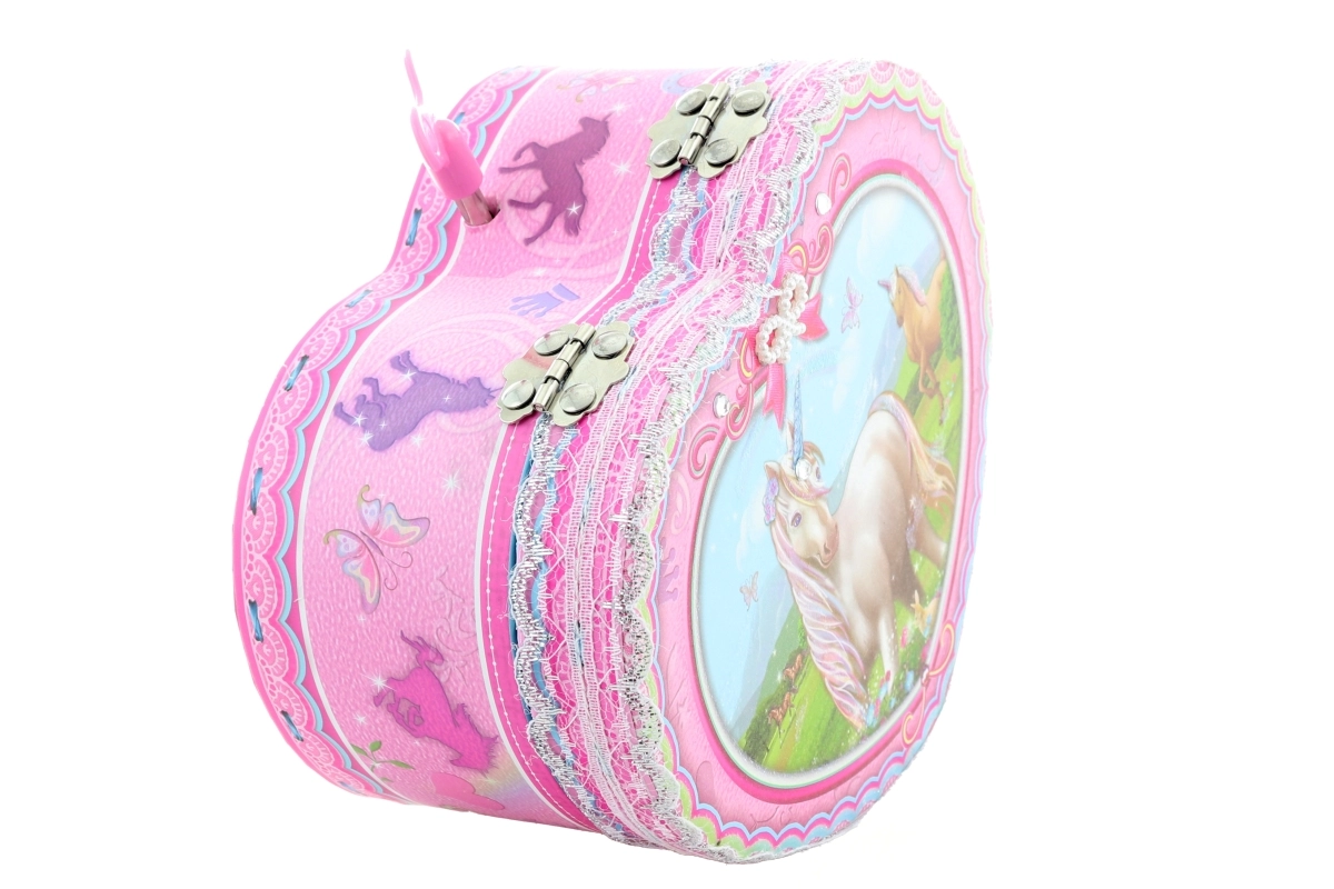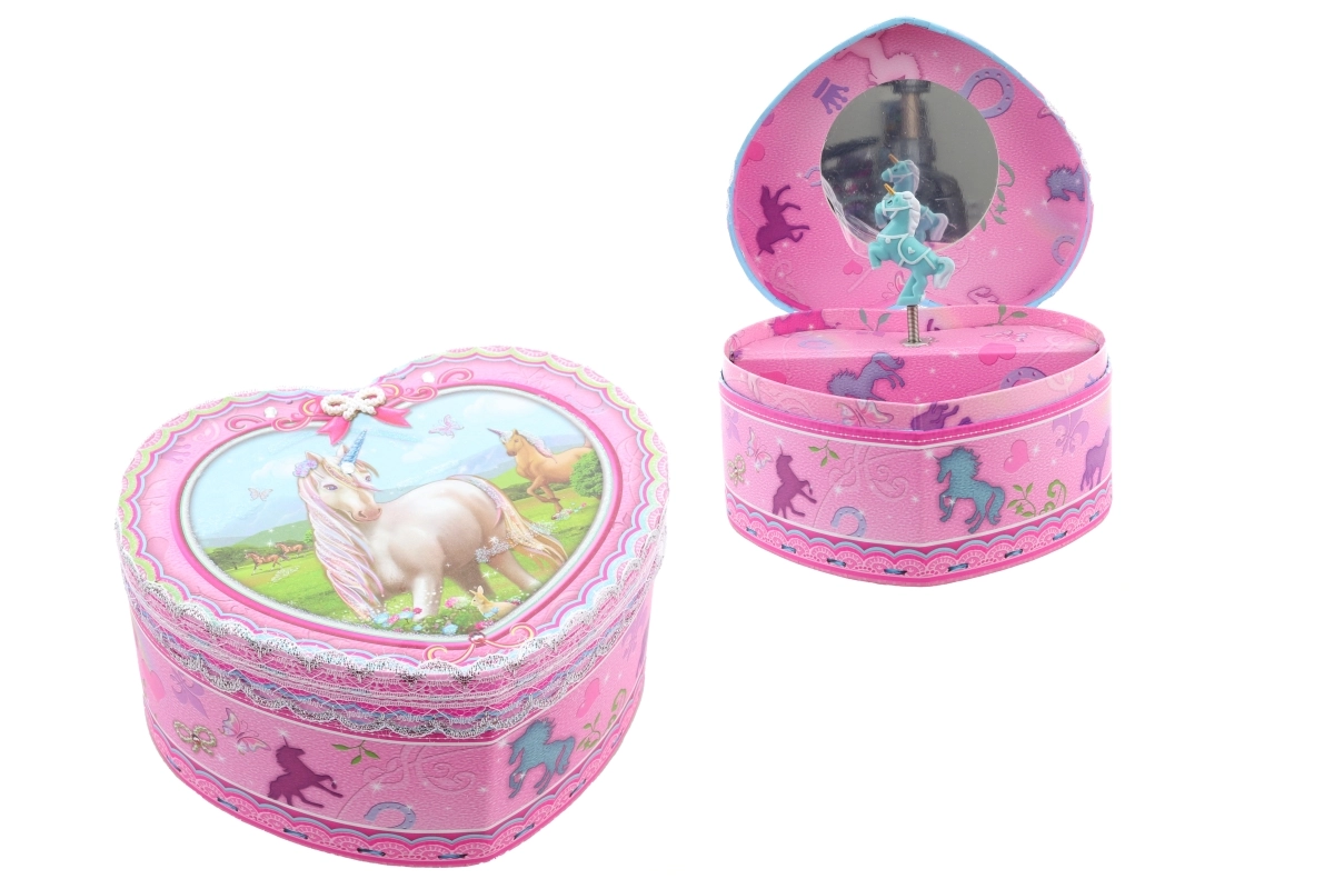 Ta očarljiva glasbena škatlica za nakit v obliki srca navduši z rožnatim dizajnom s samorogom in nežnimi okrasnimi detajli. Po navijanju ključka se ob odprtju pokrova balerina zavrti pred ogledalcem in zaigra melodija, ki ustvari čarobno vzdušje ob vsakem odlaganju nakita.