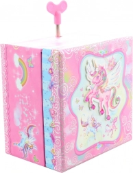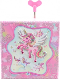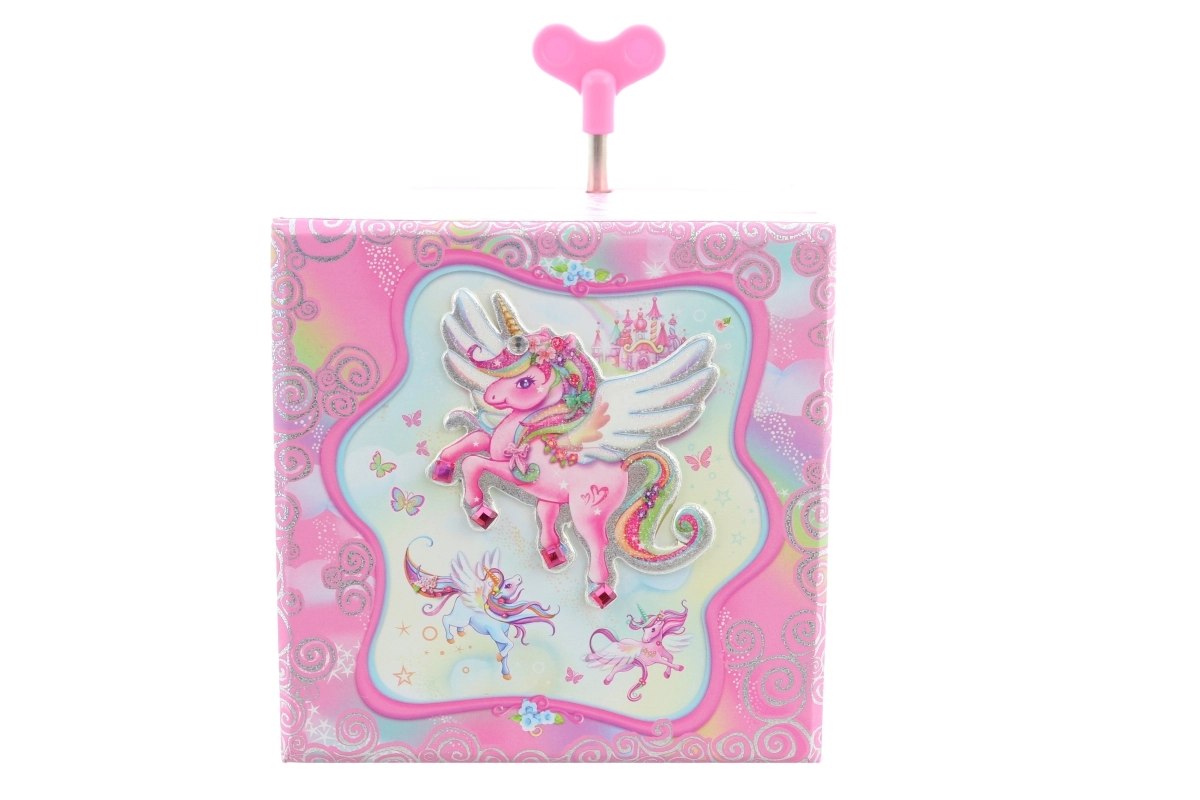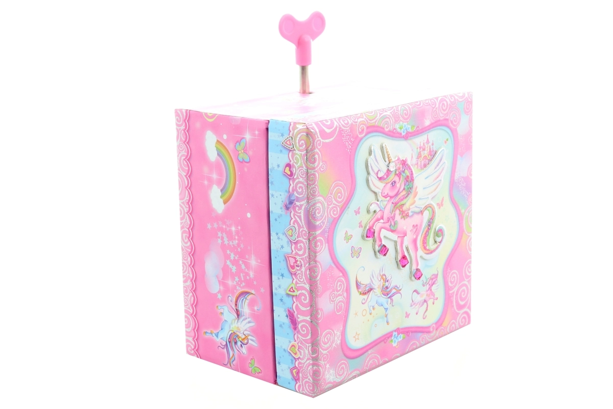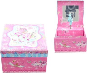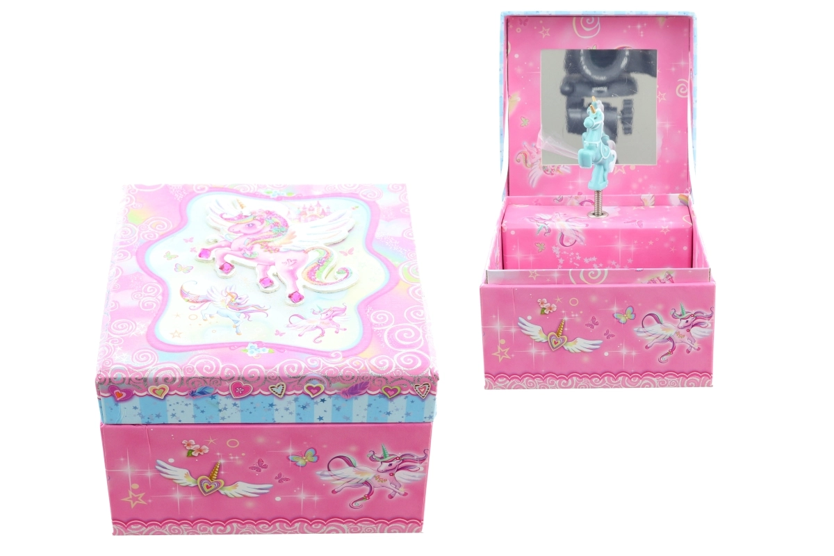 Ta glasbena škatlica za nakit v obliki skrinjice je idealna za shranjevanje prstanov, uhanov in drugih drobnih predmetov. Po odprtju pokrova se zahvaljujoč navitemu ključku figurica samoroga zavrti in zazveni prijetna melodija, ki ustvari pravljično vzdušje. V notranjosti je ogledalce za hitro preverjanje videza.
