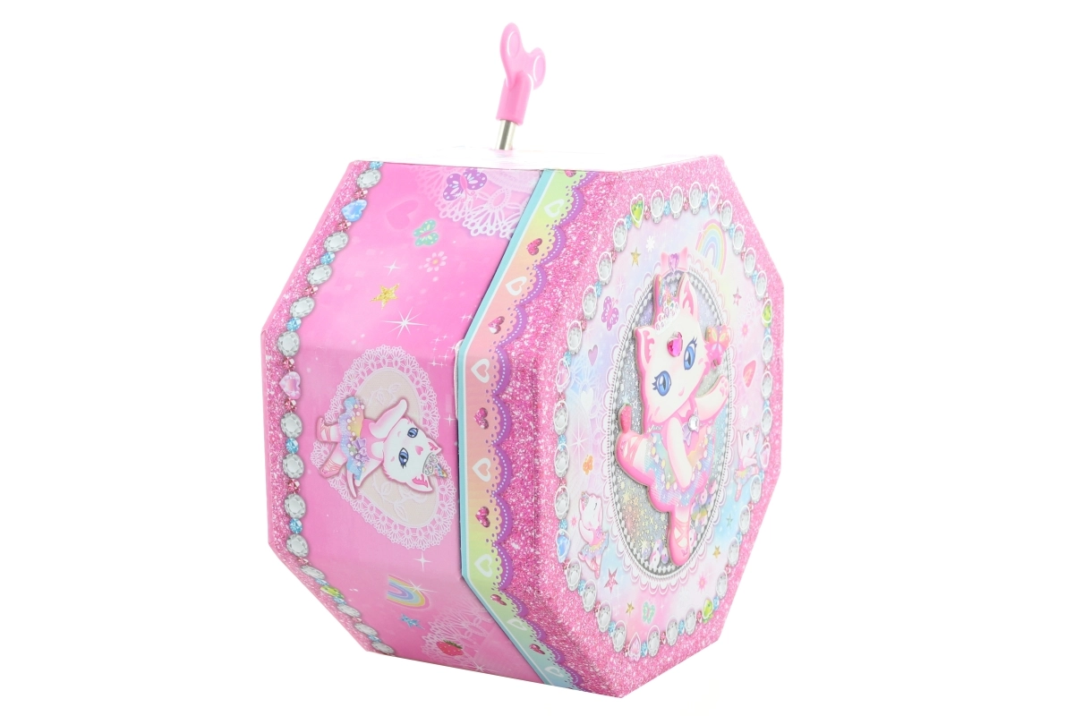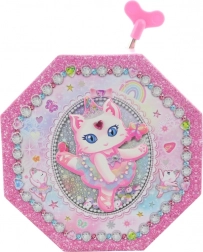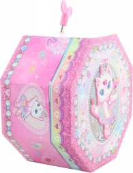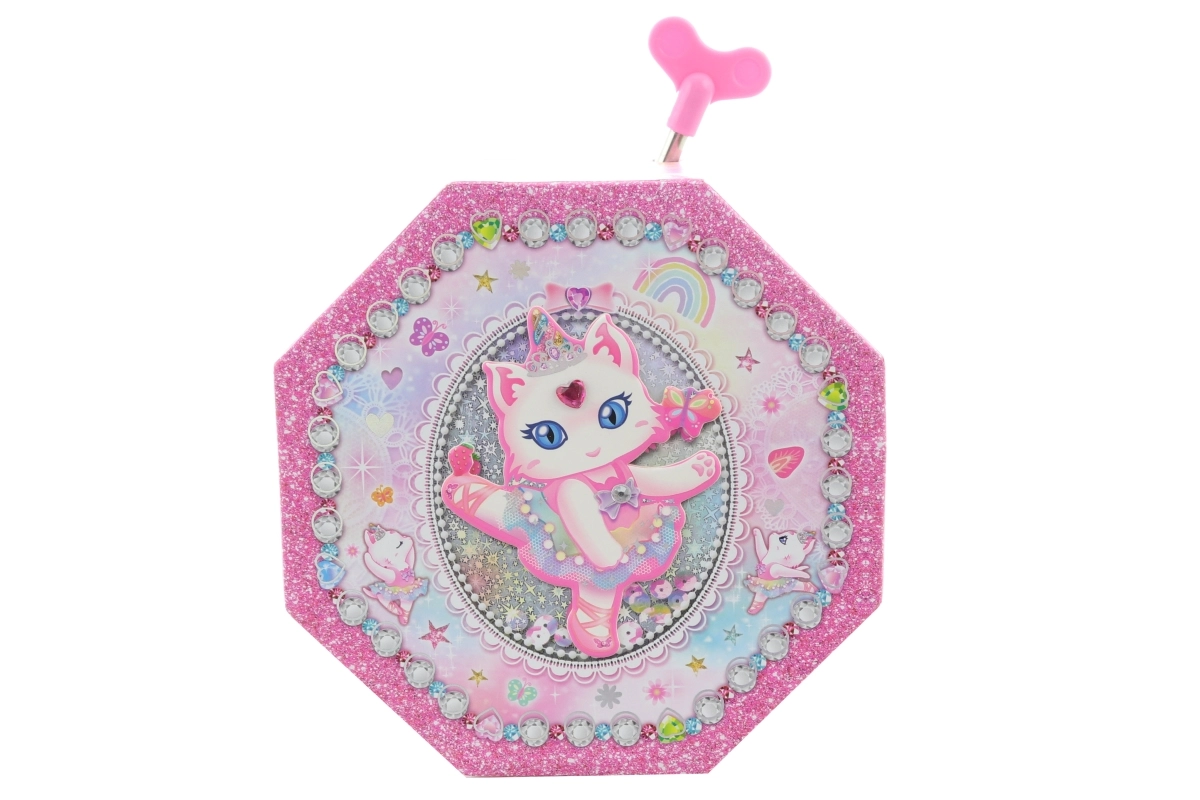 Ta elegantna rožnata glasbena škatlica za nakit združuje prikupno zasnovo s praktičnim shranjevalnim prostorom. Po navijanju mehaničnega ključka se v notranjosti pred ogledalcem zavrti balerina in zazveni melodija, ki polepša vsakokratno odpiranje pokrova. Škatlico krasijo ljubke ilustracije mačk in samorogov, bleščice ter dekorativni kamenčki.