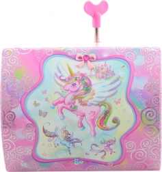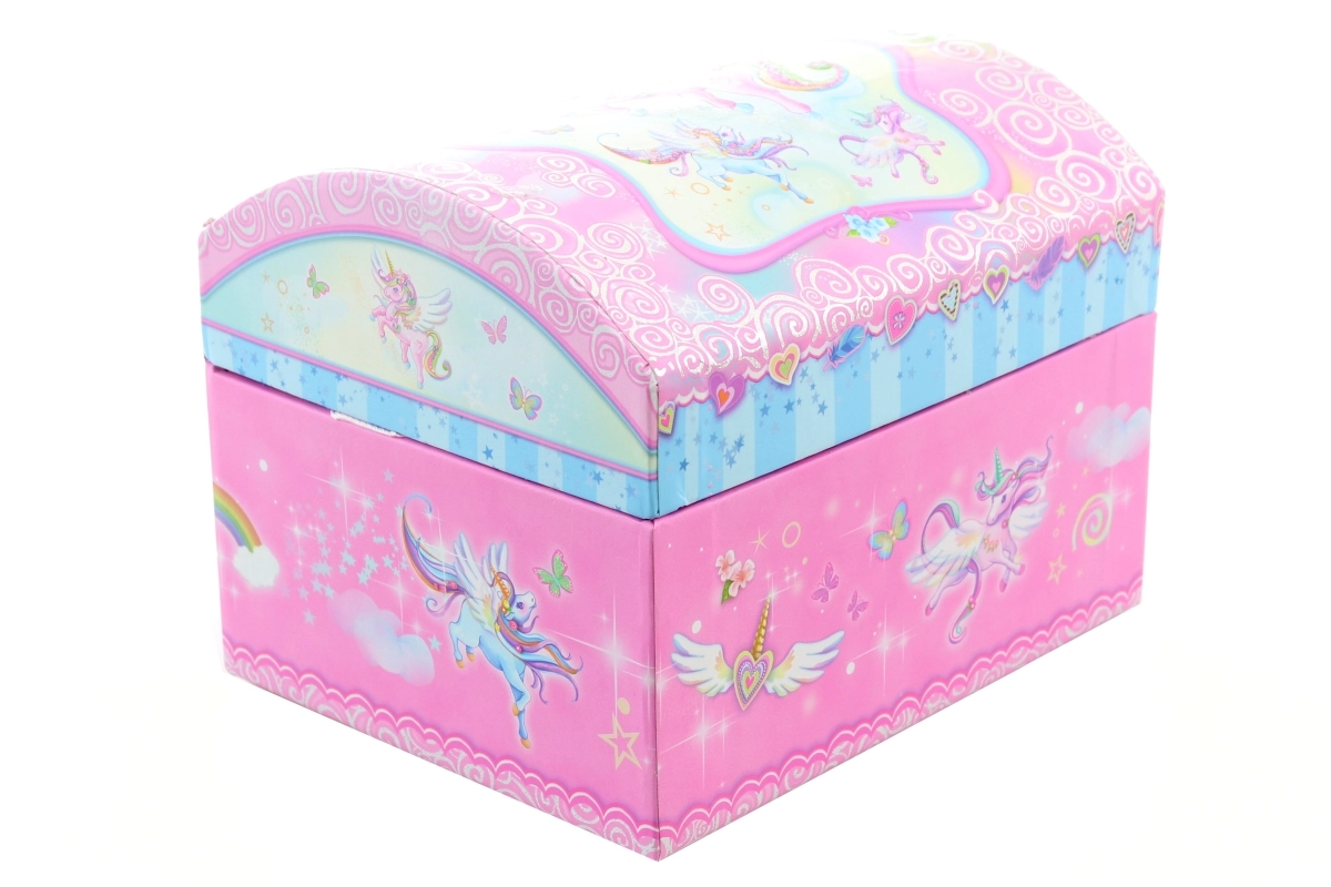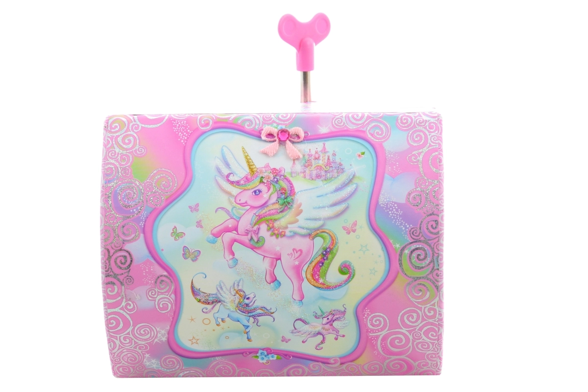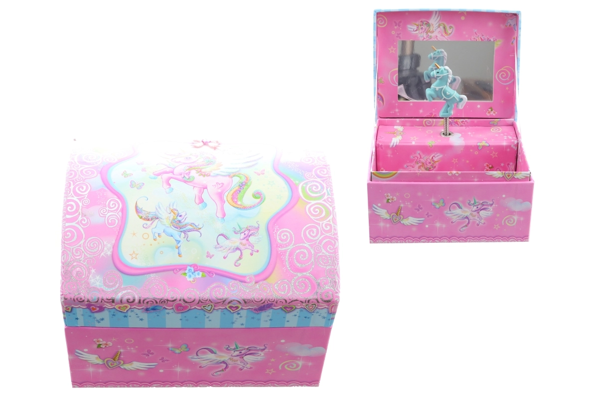 Ta očarljiva otroška škatlica za nakit v rožnati barvi združuje praktično shranjevanje drobnih predmetov z magično izkušnjo. Po navijanju ključka se pred ogledalcem v notranjosti zavrti balerina in zazveni prijetna melodija. Motiv samorogov in bleščeči detajli jo naredijo za popoln dodatek otroški sobici.