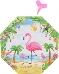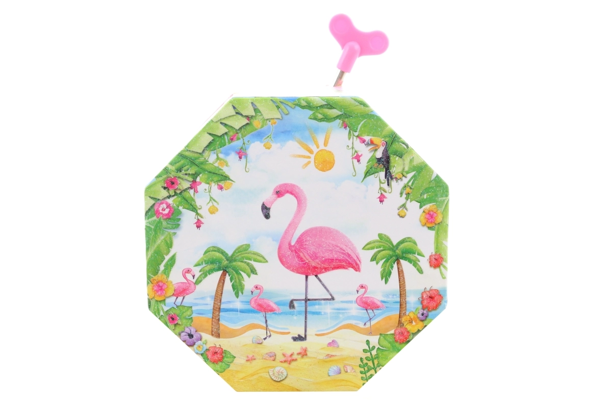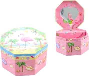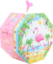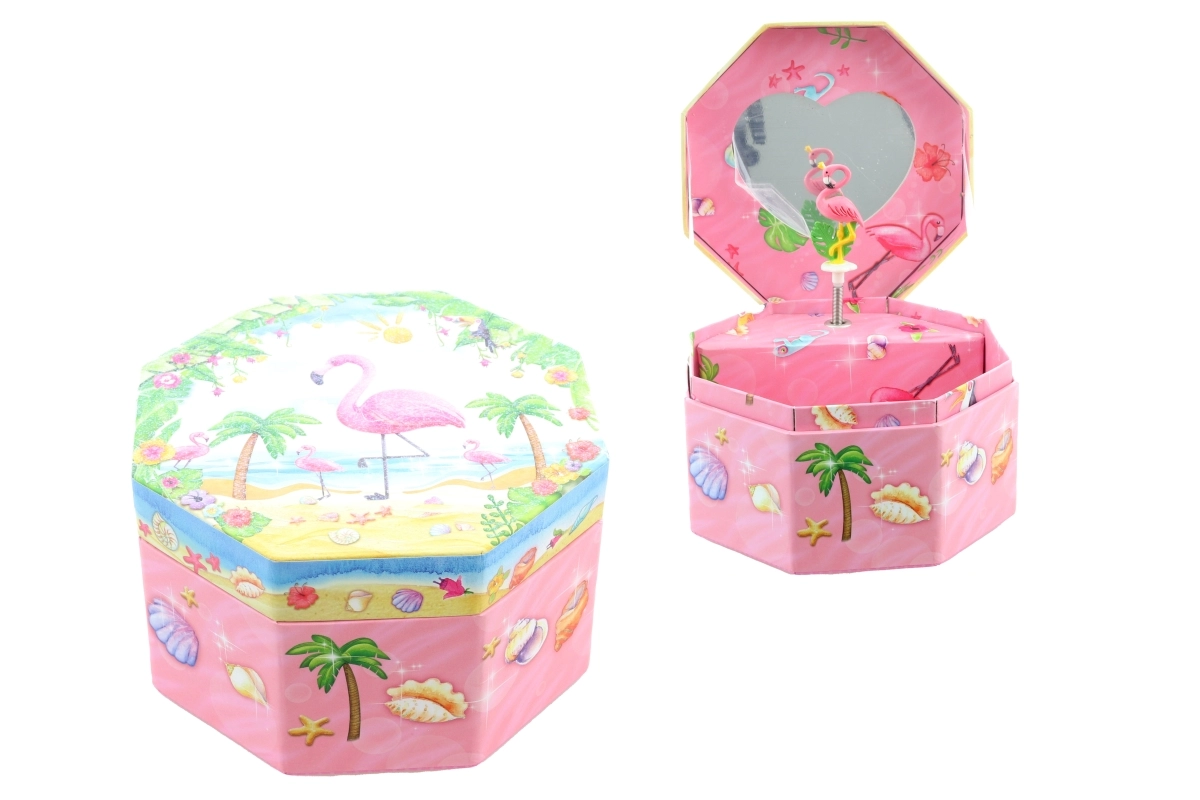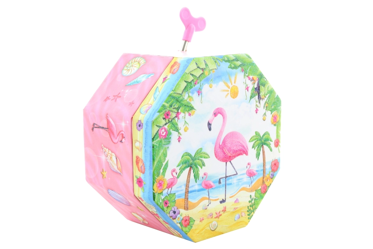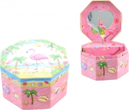 Ta očarljiva glasbena škatlica za nakit v rožnati izvedbi se ponaša z osmerokotno obliko in tropskim motivom s flamingom, palmami in školjkami. Po odprtju se prikaže plesoči flamingo pred srčkastim ogledalcem, ki se zavrti po navijanju ključka in shranjevanje nakita spremlja prijetna melodija.