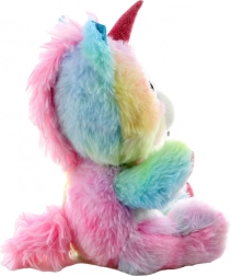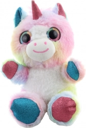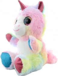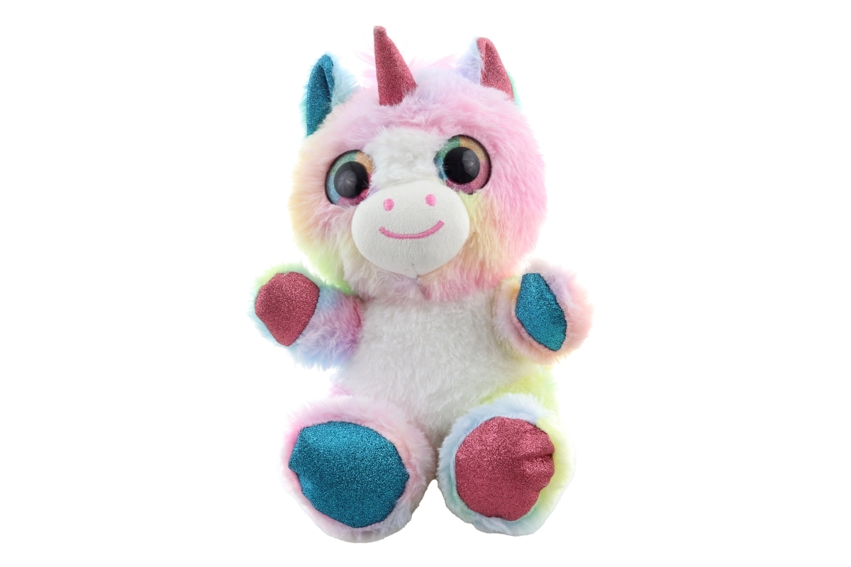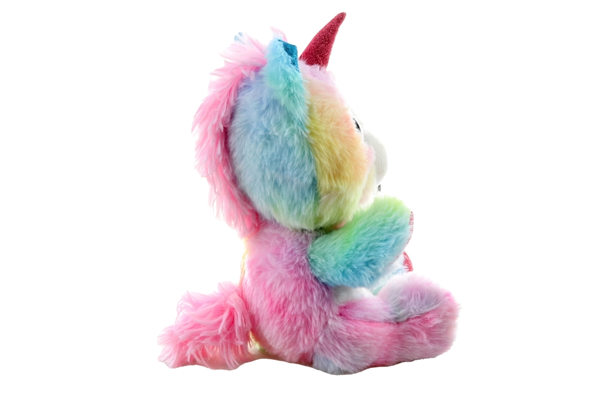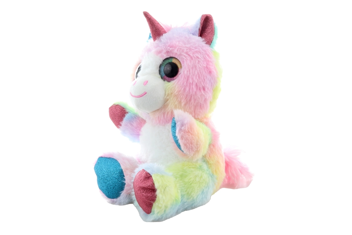 Ta barviti plišasti samorog bo osvojil otroška srca z nežno površino in čarobnim videzom. Pastelni mavrični odtenki, bleščeči detajli na rogu, ušesih in kopitcih ter velike vezene oči ga naredijo odličnega prijatelja za igro in uspavanje.