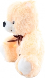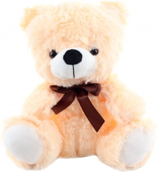 Kontrastne tačke, všiti potezi in elegantna rjava mašna dajejo medvedku očarljiv videz, ki razveseli otroke in odrasle.