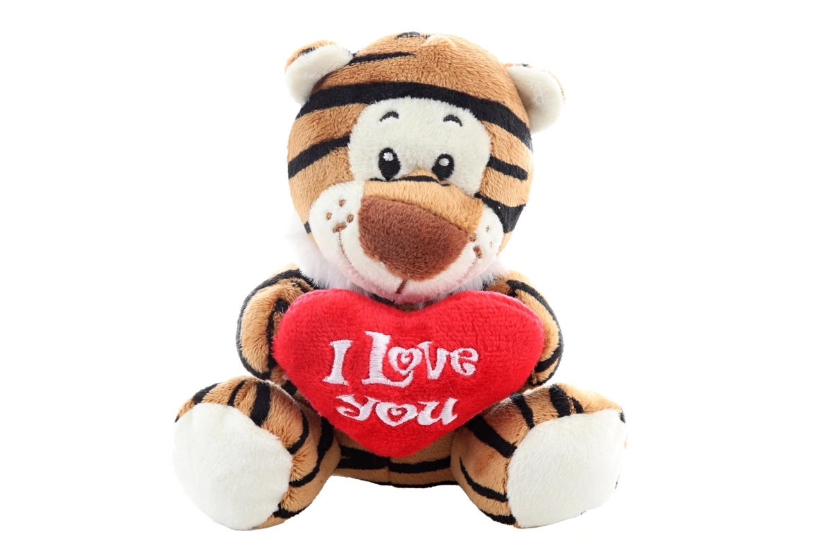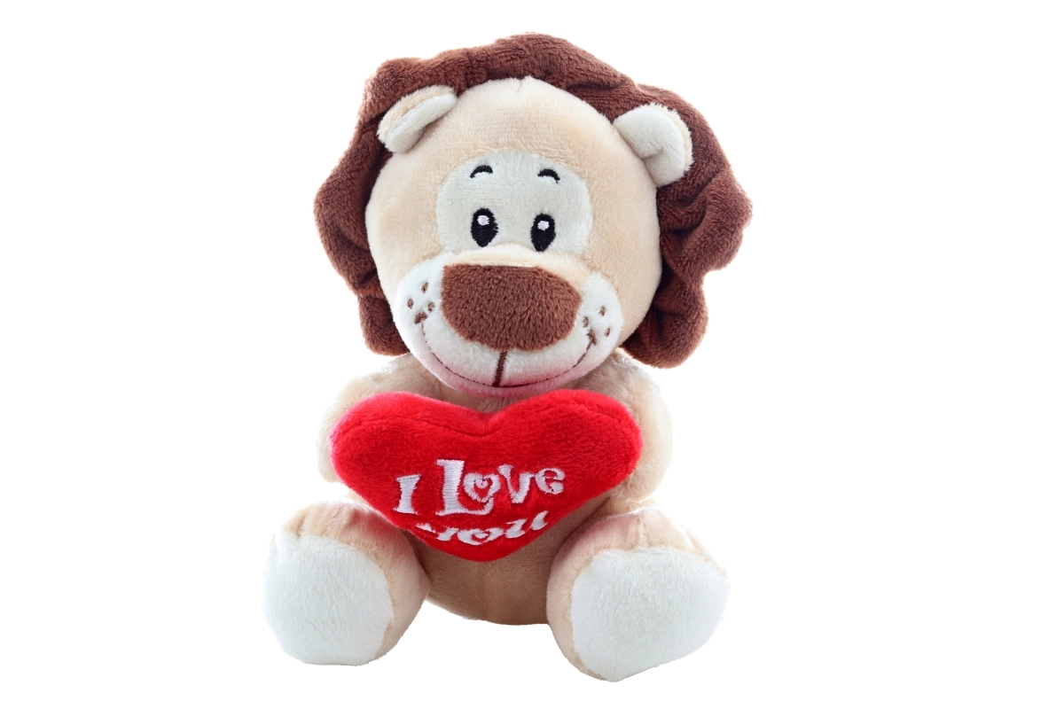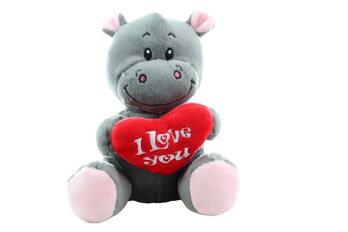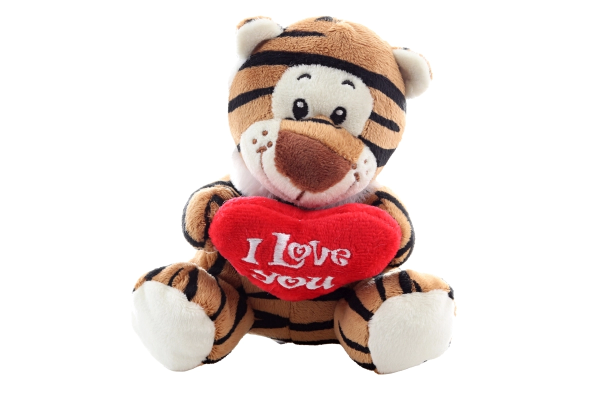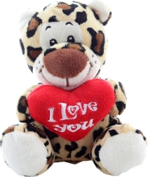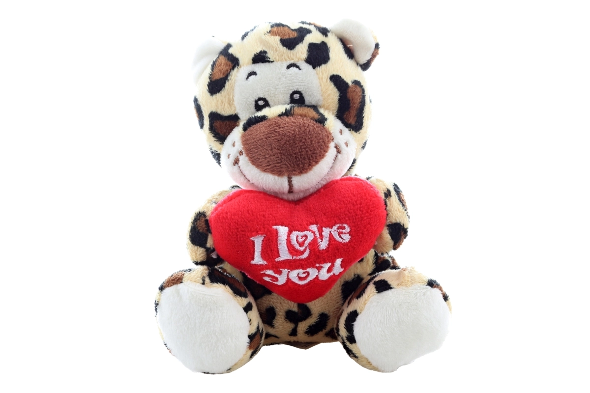 Vpadljiv rdeč srček z vezenim napisom doda igrački čar in jo spremeni v popolno darilo iz ljubezni.