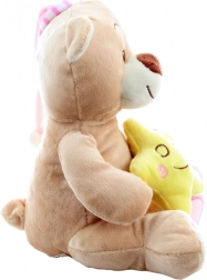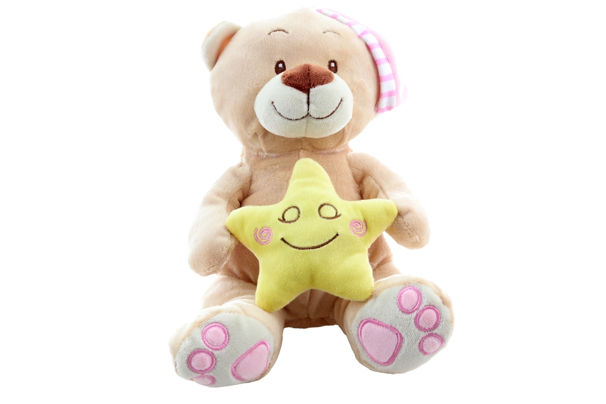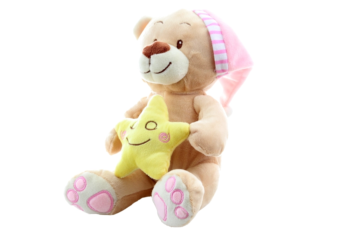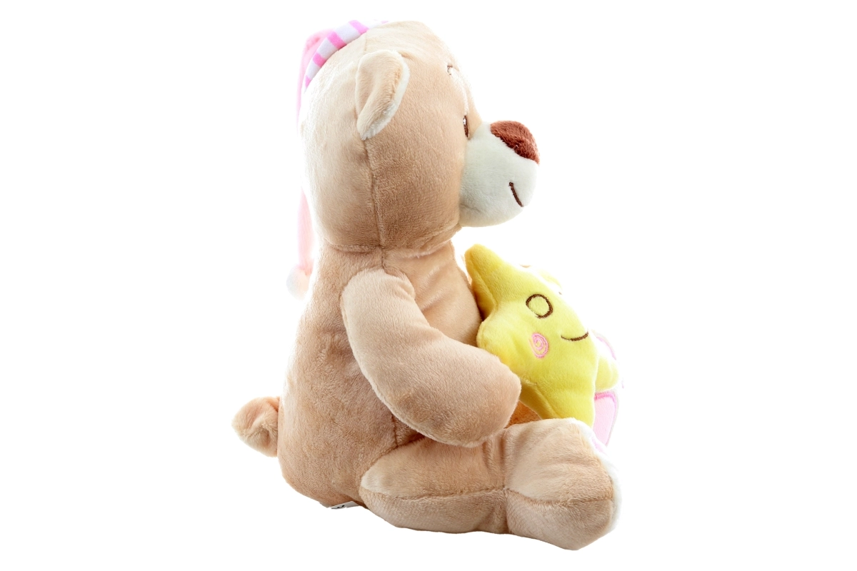 Ta mehkoben medvedek z rožnato spalno kapico in nežno rumeno zvezdico v dlani otrokom prinaša občutek varnosti in mirnega spanca. Zaradi kakovostne izdelave in vezenih detajlov je primeren tudi za novorojenčke.