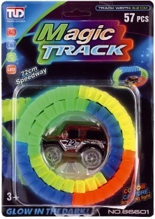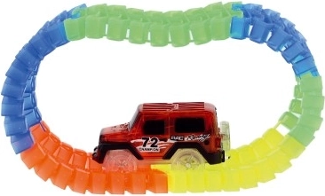 Sestavite si svojo svetlečo dirkalno stezo in pošljite na progo hitri avtomobilček! Prilagodljive dele lahko zlahka upogibate v različne oblike; steza ima 57 delov dolžine 72 cm, avtomobilček s 3 utripajočimi lučkami pa deluje na 1× AA baterijo (ni priložena). Idealno za otroke od 3 let – zabava, ustvarjalnost in razvoj fine motorike.