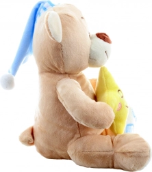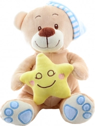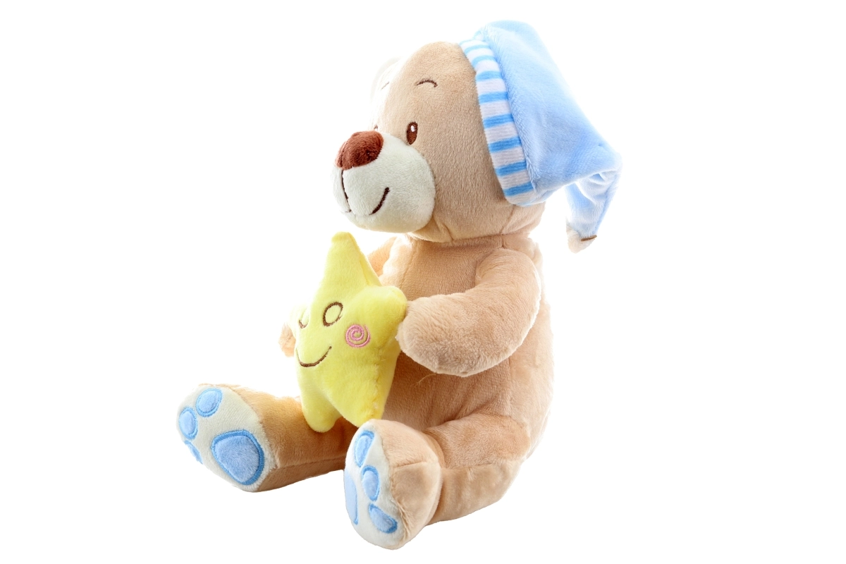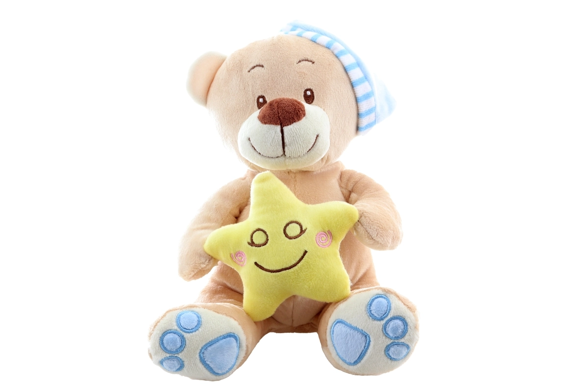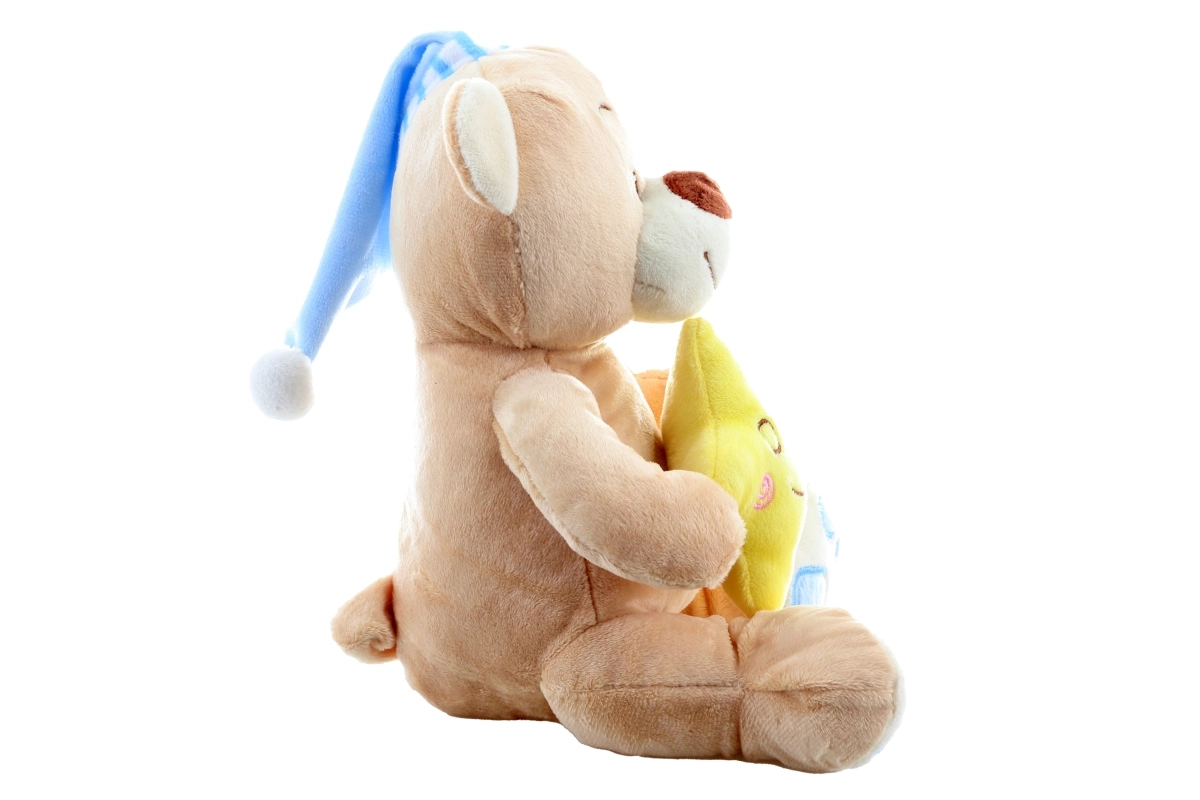 Ta nežen plišasti medvedek z modro kapico prinaša otrokom občutek miru in varnosti. Rumena zvezdica v tačkah podpira pomirjujoče rituale pred spanjem, medtem ko mehki materiali kar vabijo k crkljanju. Zaradi izvezenih oči in nasmeha je igrača primerna tudi za najmlajše.