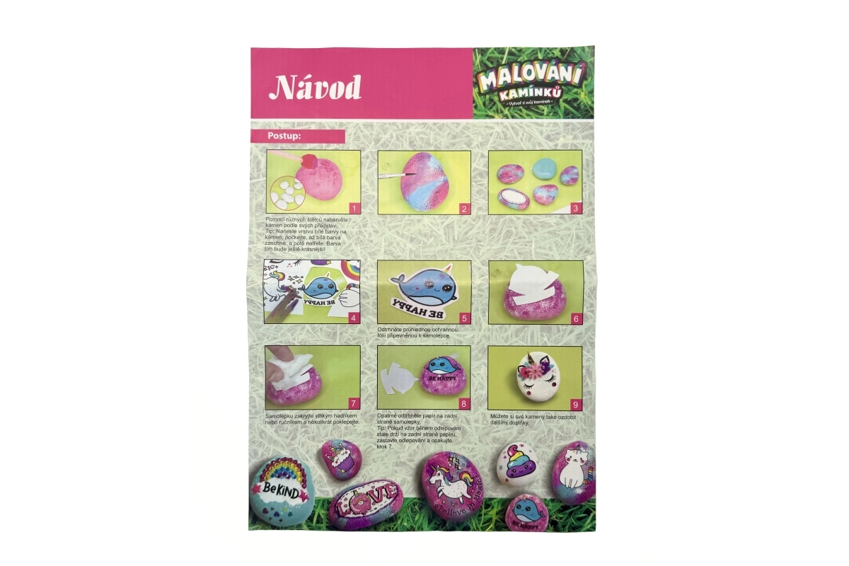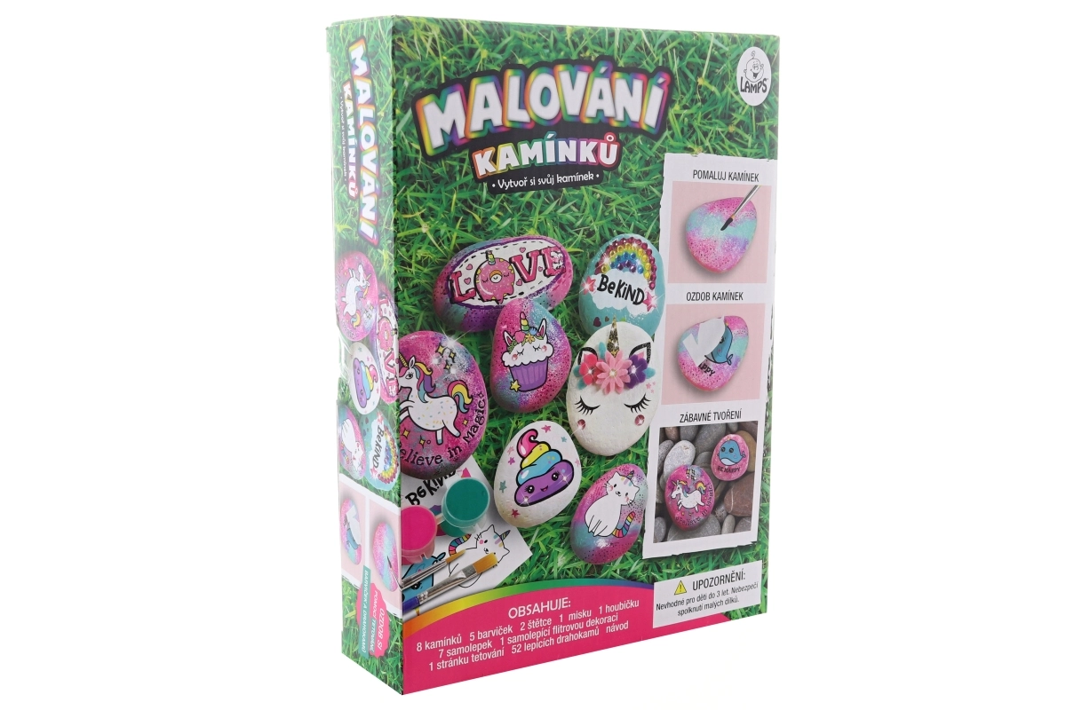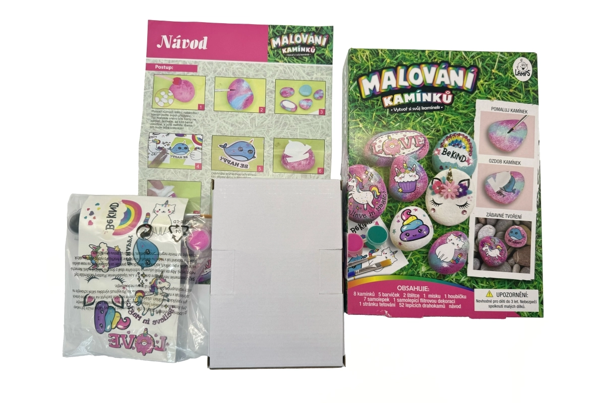 Ta čarobni komplet za barvanje kamnov s motivom samorogov spodbuja otroško domišljijo in ustvarjalnost. Otroci lahko okrasijo gladke kamne z barvami, dodajo blešč in prilepijo dragulje za pravljičen videz. Vse je pregledno zapakirano v škatli, zato je odlično tudi kot darilo.