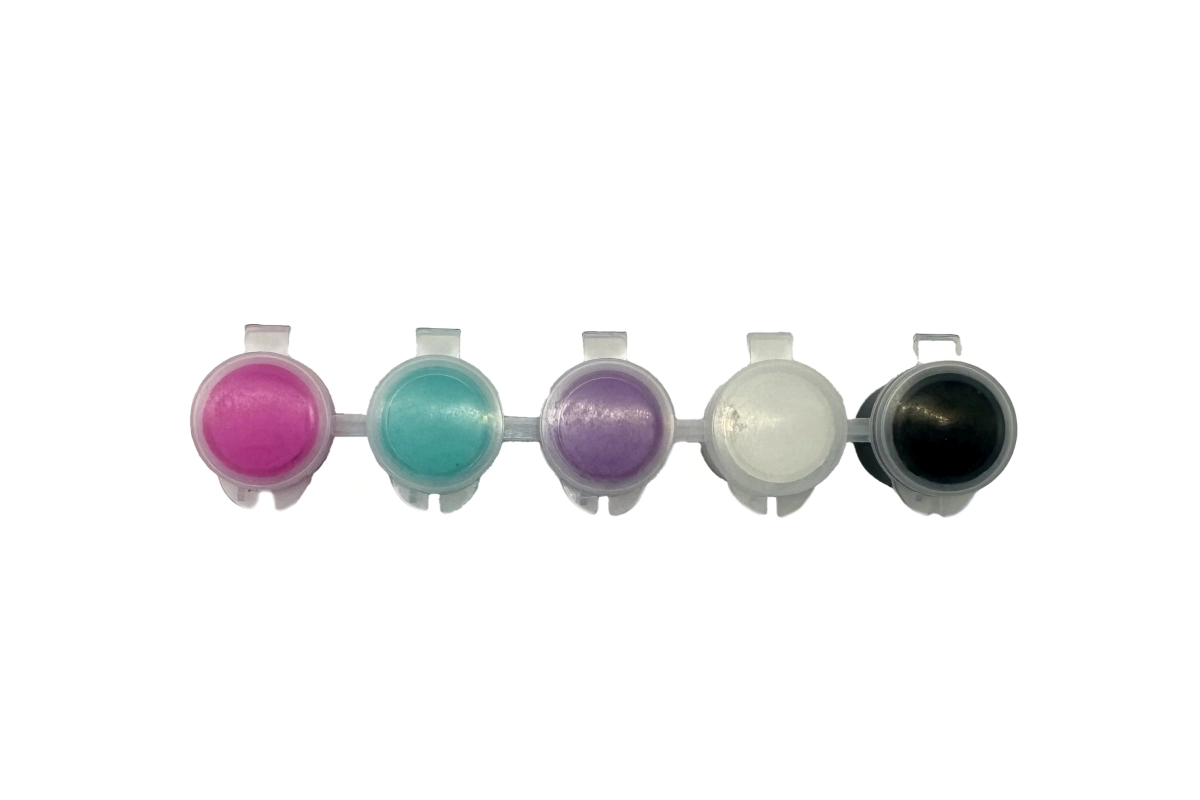 Komplet vključuje 5 pastelnih odtenkov v povezanih lončkih s preklopnimi pokrovčki. Barv se ne prelivata in manj se razlivata – idealno za otroško ustvarjanje.
