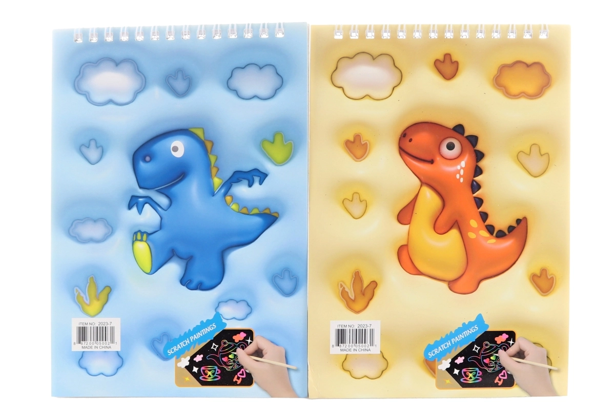 Odkrijte čar praskalnih podob s praktičnim zvezkom z motivom dinozavra. Dovolj je, da vzamete priloženi leseni svinčnik in z nežnim praskanjem črne plasti razkrijete pisane barve podlage. Odlično za razvoj ustvarjalnosti, potrpežljivosti in fine motorike.