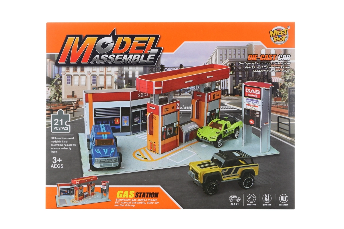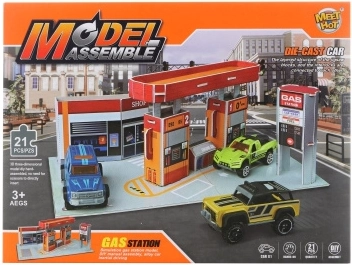 Posamezni deli iz mehkega kartona se zlahka povezujejo in ustvarijo stabilen model črpalke s priročnimi merami za igro na mizi ali tleh. Celotno pakiranje je kompaktno in primerno tudi kot odlično darilo za male ljubitelje avtomobilov in gradbenih kompletov.