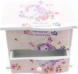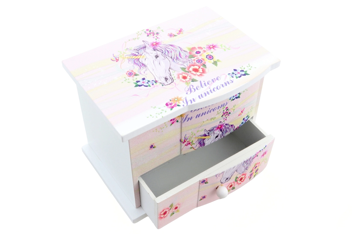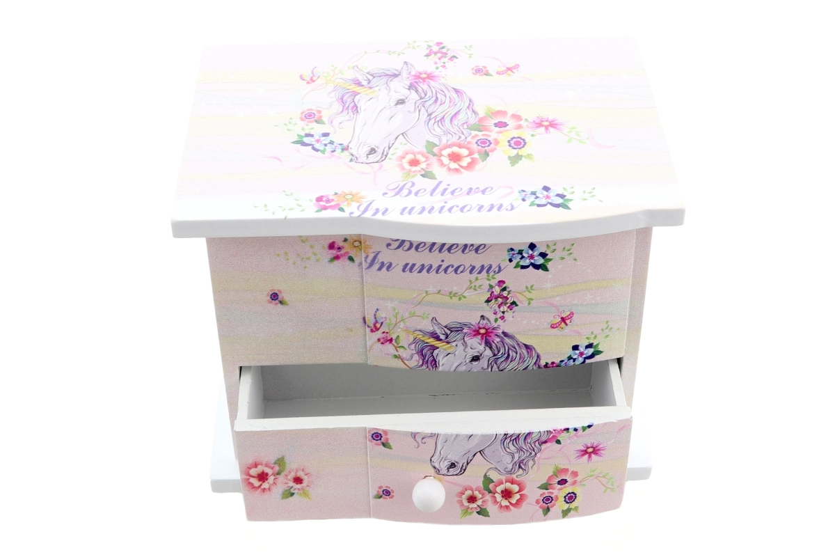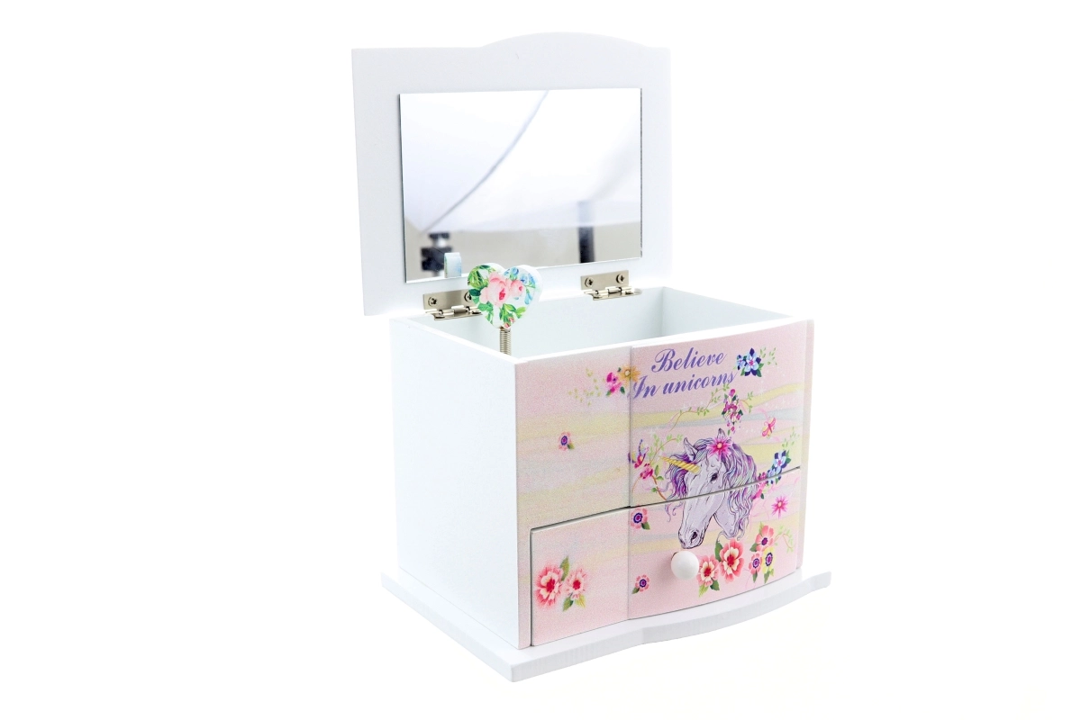 Ta ljubka lesena škatlica za nakit z motivom samoroga odlično varuje otroške zaklade – prstančke, zapestnice in skrivne drobnarije. Po odprtju pokrova se zavrti srček in zazveni nežna glasba, ki pričara nasmeh ob vsaki uporabi. Zgornji del skriva praktično ogledalo za hitro preizkušanje nakita, spodaj pa najdete predal za dodatne drobnarije.