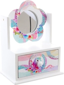 Zgornje ogledalce v obliki cveta omogoča udobno preizkušanje dodatkov, spodnji izvlečni predalček pa poskrbi, da je vse lepo pregledno na svojem mestu. Kakovostna lesena konstrukcija zagotavlja stabilnost in dolgo življenjsko dobo.