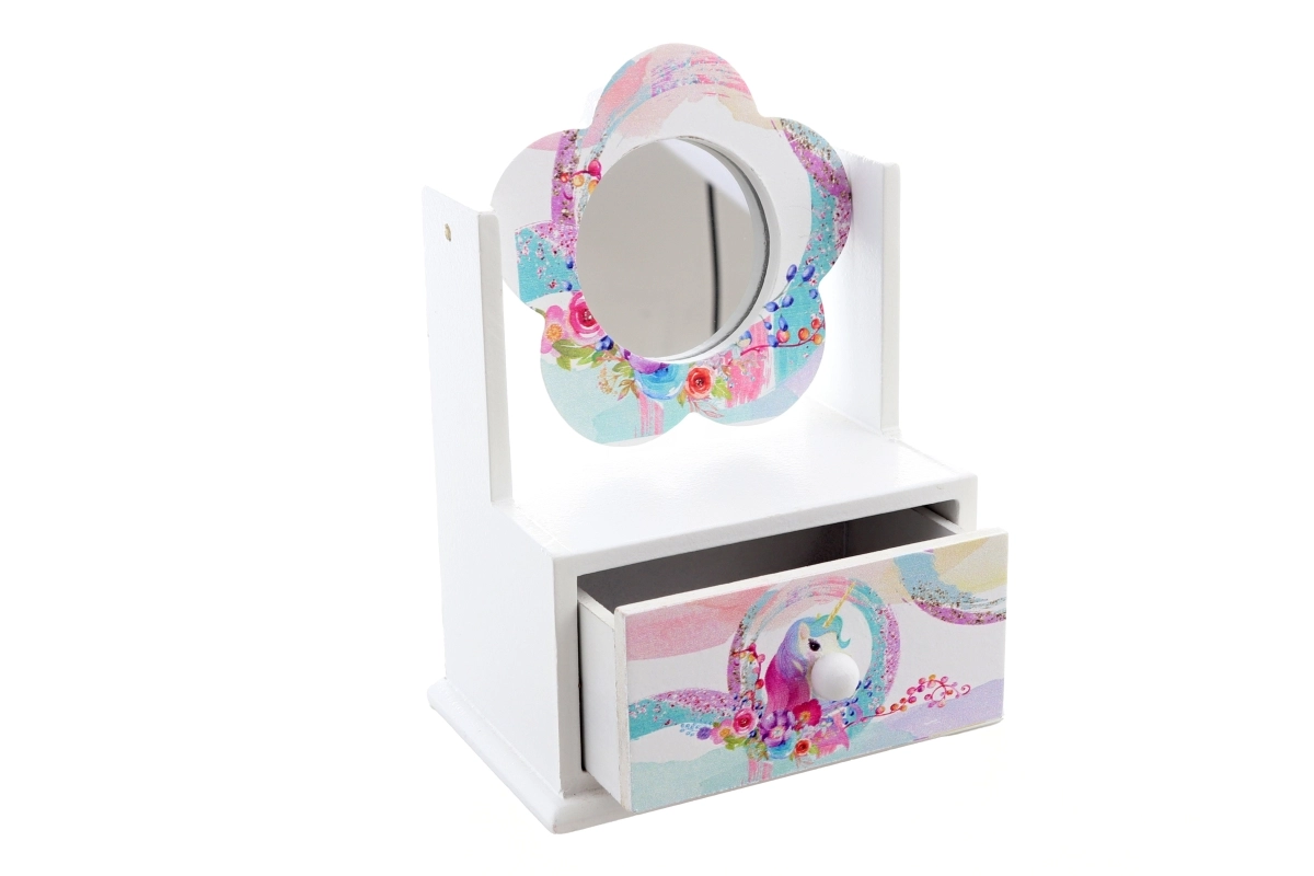 Čarobna lesena škatlica za nakit s cvetličnim ogledalcem in nežnim motivom samoroga je idealna za shranjevanje prstanov, zapestnic in drobnih zakladov. Kompaktne mere, trdna lesena izdelava in praktičen predalček jo delajo odličen dodatek otroški sobi in prijetno darilo. Primerno za otroke od 3 let.