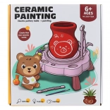 - Lončarski kolovrat z nogicami, 2 vrečki z glino, 2 čopiča, paleta z barvami, manjši dodatki, navodila