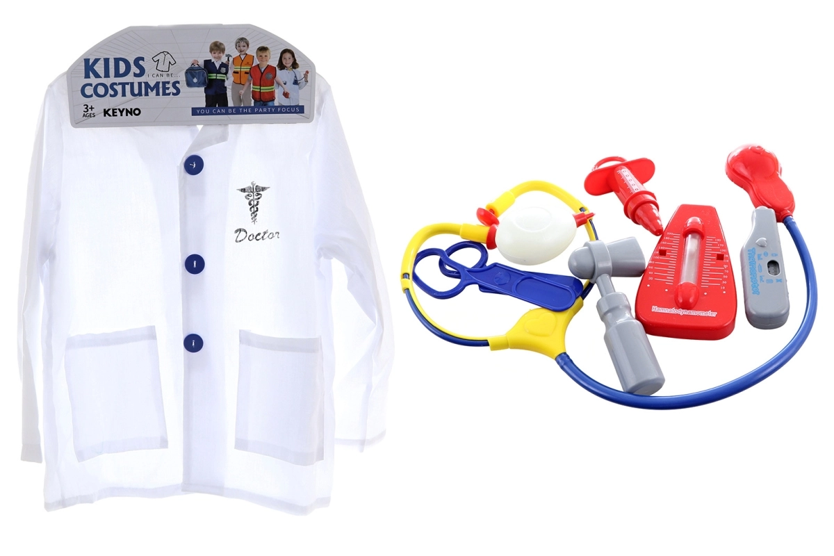 - Vsebina paketa: otroški zdravniški plašč + set zdravniških pripomočkov