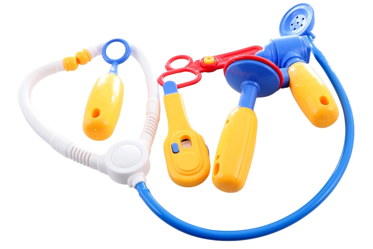 Lahka plastična orodja, kot so stetoskop, termometer in injekcija, za igrive preglede brez tveganja.