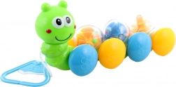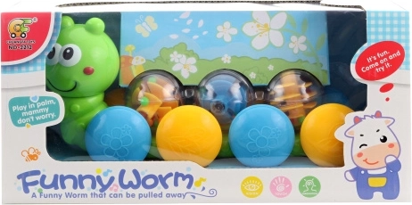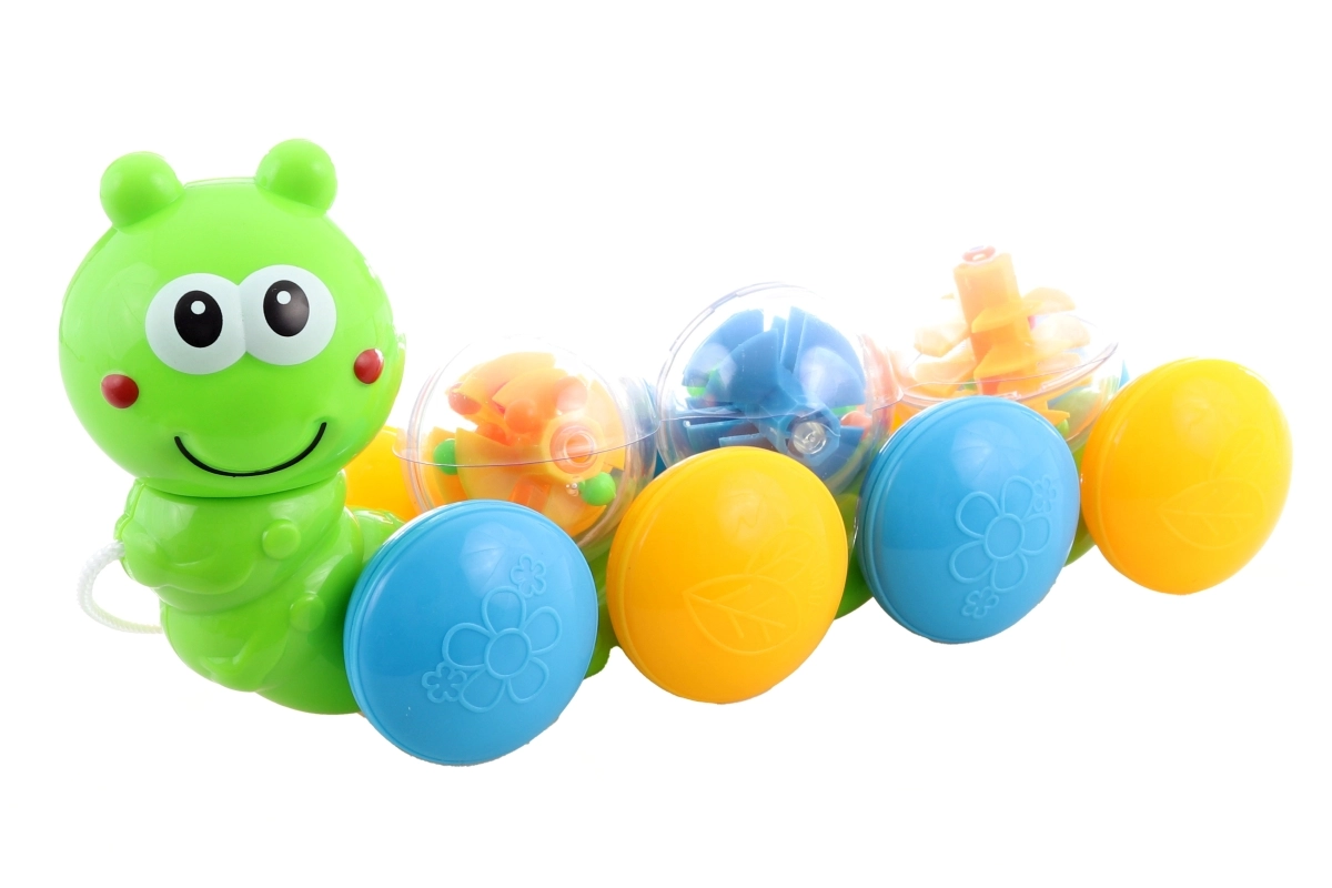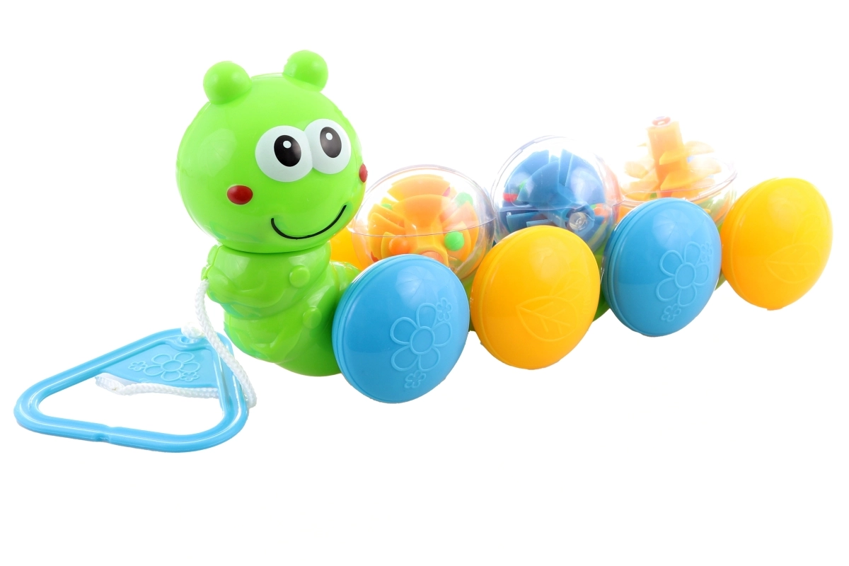 Ta vesela vlečna gosenica je idealen spremljevalec za otroke, ki začenjajo odkrivati svet na lastnih nožicah. Zahvaljujoč priročni vrvici jo lahko vlečejo za seboj, kar naravno podpira razvoj grobe motorike, koordinacijskih spretnosti in ravnotežja.