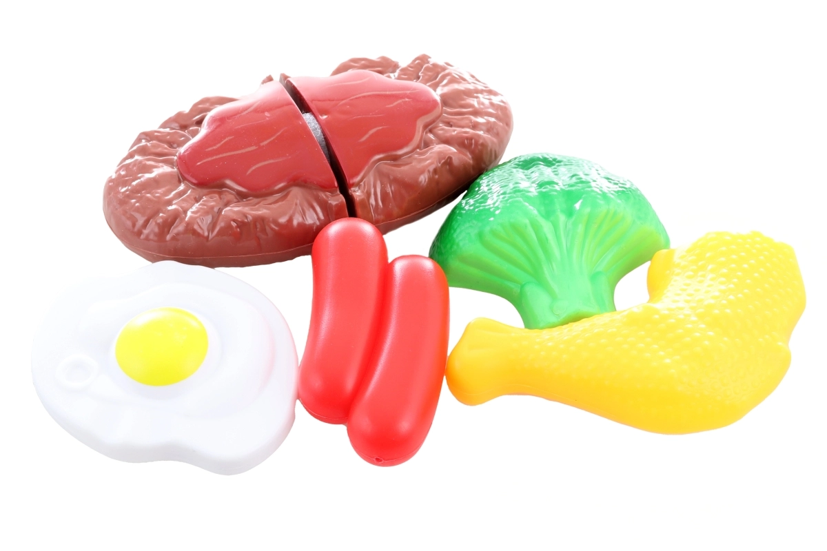 Jajce, zrezek, hrenovke, piščančje bedro, riba in zelenjava v živih barvah spodbujajo domišljijo in učijo otroke prepoznavati vrste živil.