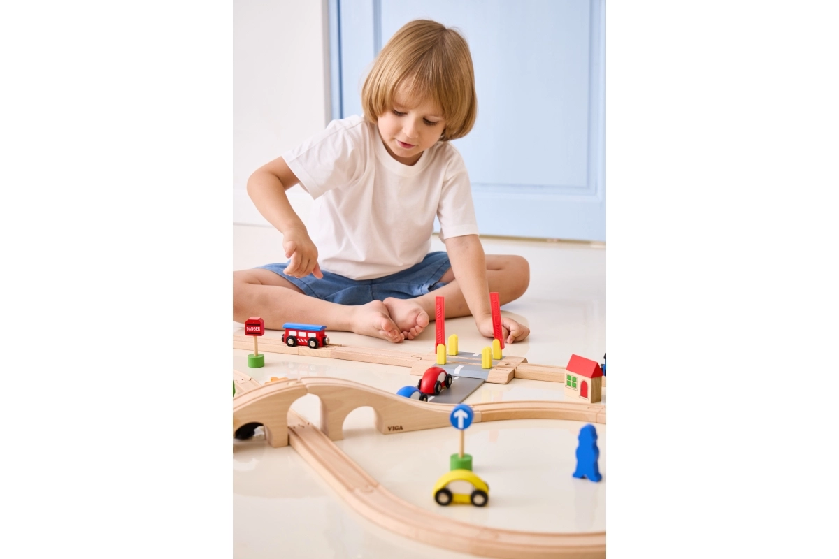Masivna lesena konstrukcija in čvrsti deli zdržijo vsakodnevno igro. Idealni dodatek k igralnim setom z vlaki, avtomobilčki in prometnimi znaki.