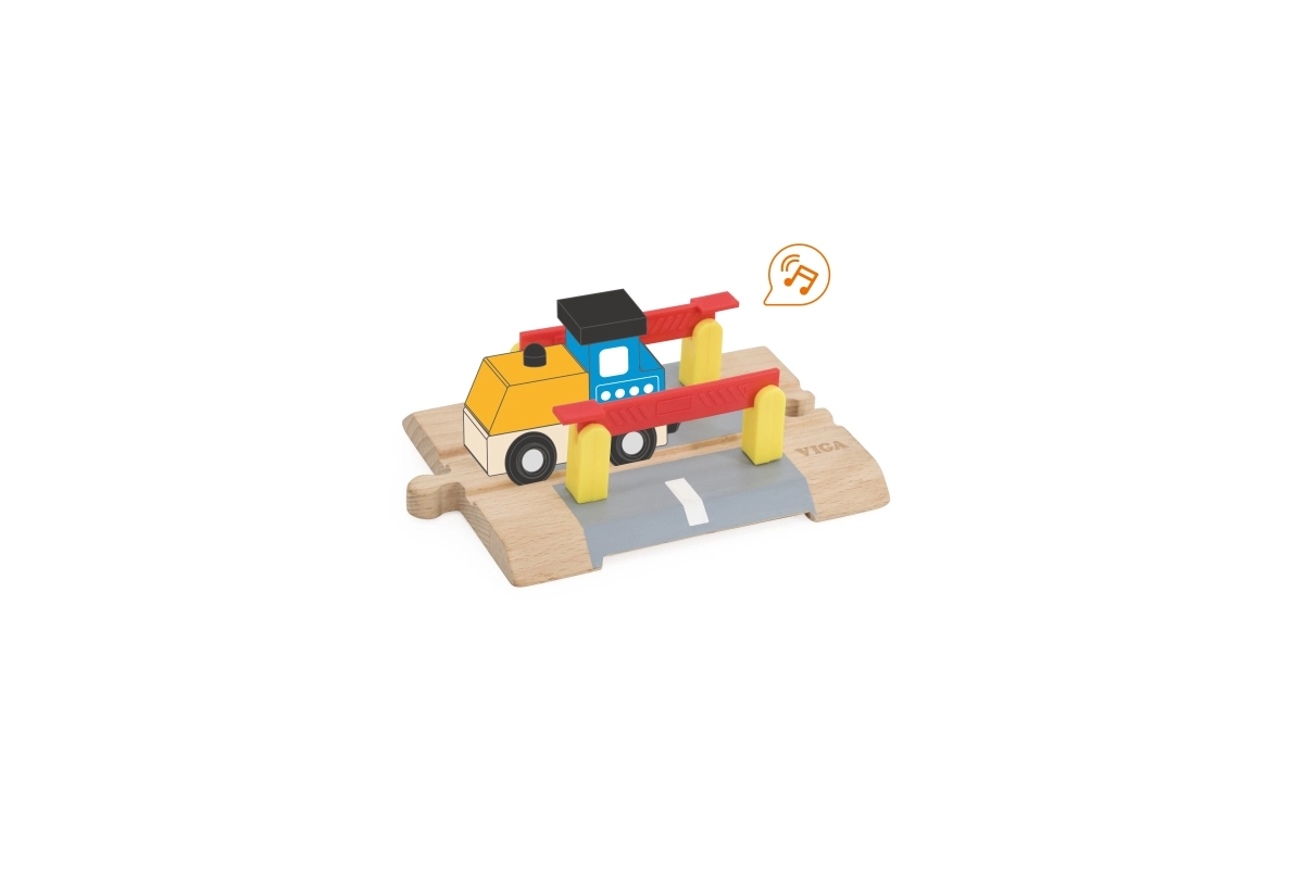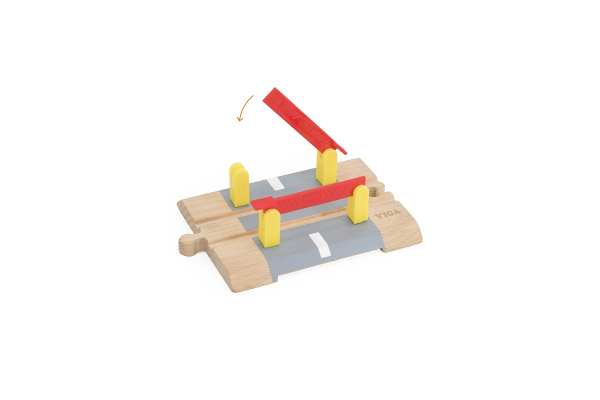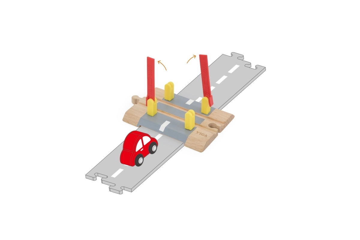 Ta kakovostno izdelan lesen prehod odlično dopolni vsako železniško progo ali cestni set. Premične rdeče zapornice in izraziti stebrički verno posnemajo resničen promet, zato se otroci zlahka poglobijo v igro in izmišljajo lastne prometne situacije.