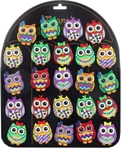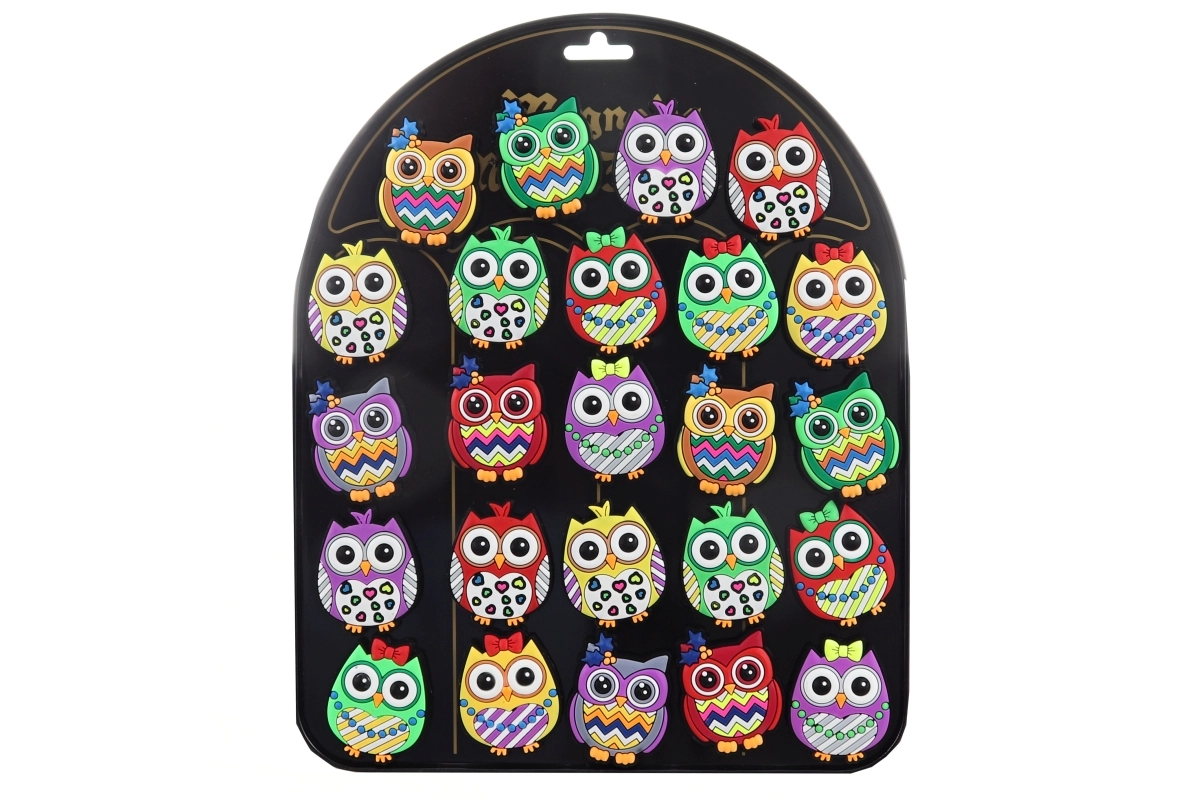 Ljubki magnetki z motivom sovic polepšajo hladilnik, tablo in oglasno desko. Pakiranje vsebuje 24 kosov in magnetno ploščo za pregledno shranjevanje. Magneti so iz mehke plastike, merijo približno 4,5 × 3,5 cm in so namenjeni dekorativni uporabi.