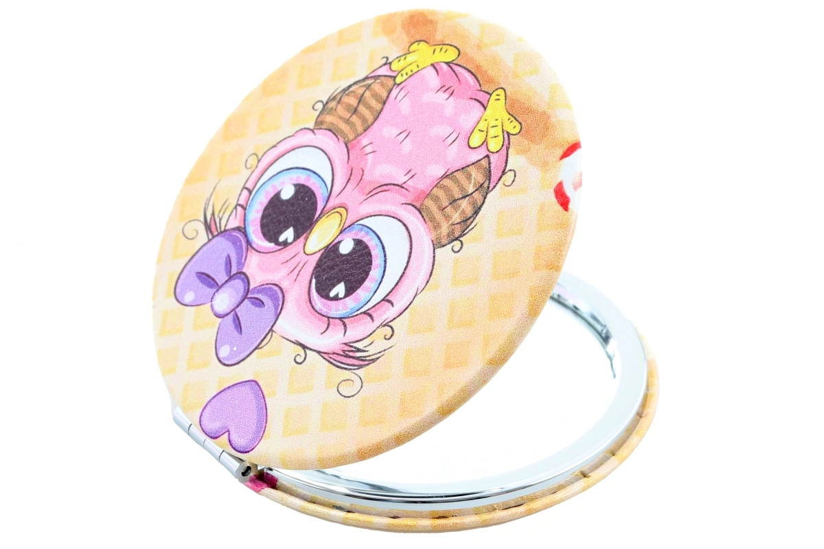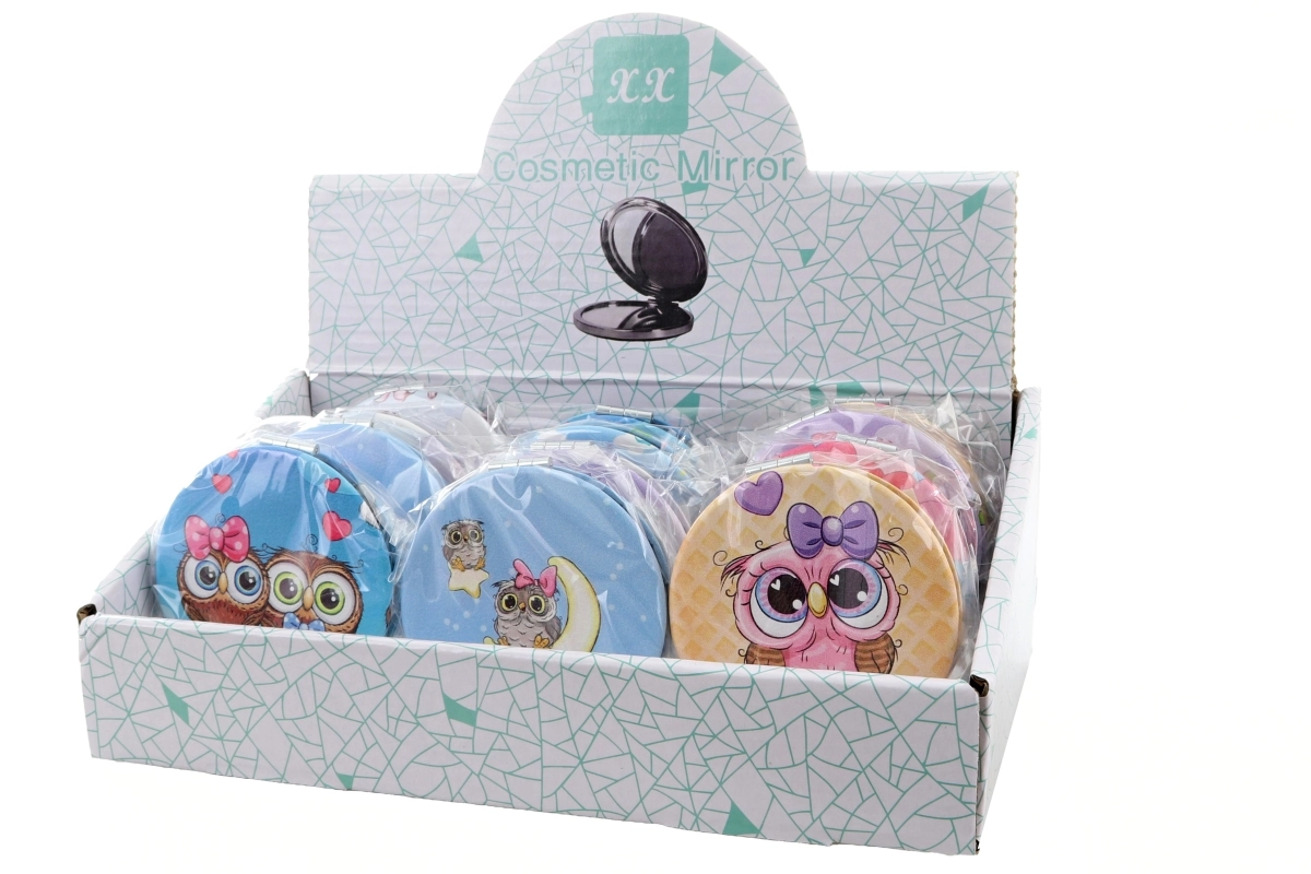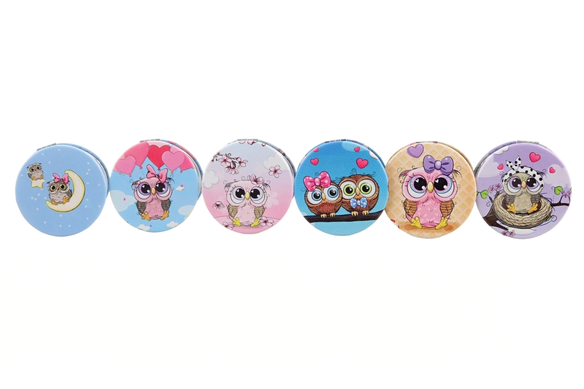 Po odprtju vas pričaka dvojno ogledalce – priročno za natančne popravke ličil ali hitro ureditev pričeske čez dan. Ogledalca so dobavljiva v različnih dizajnih z motivi sovic; konkretna različica je izbrana glede na zalogo.